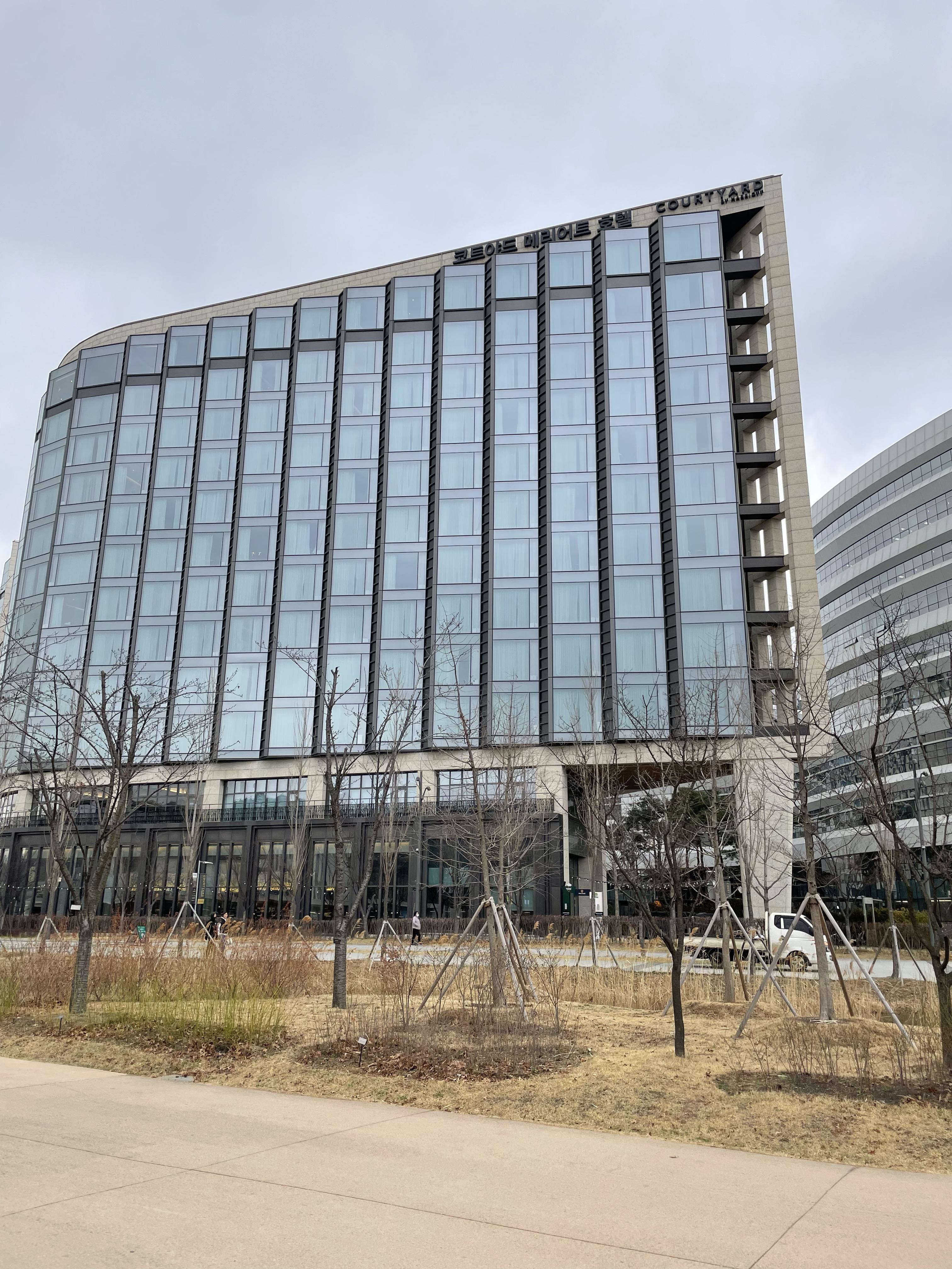 제공해준 호텔은 LG 사이언스파크 바로 옆에 있는 코트야드 메리어트 호텔이었다. 뭐 무료로 제공해주는거니 뭐가 불만이겠냐만은, 이 호텔은 수목원 뷰로 유명한 것 같은데 내 방은 반대방향 뷰로 픽스가 되어있었다ㅠ