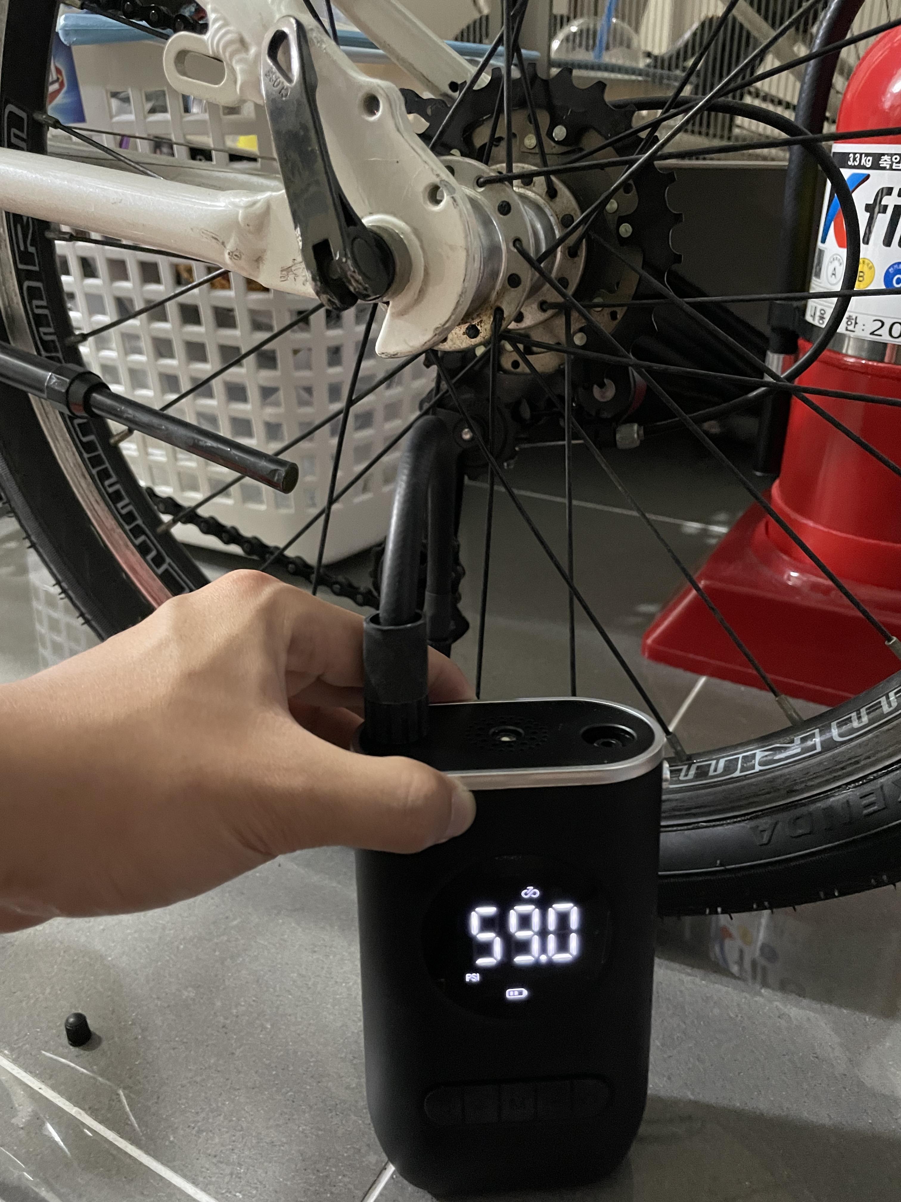 다들 알고 있을 수도 있겠지만, 이번에 알게 된 꿀팁을 알려주자면, 자전거는 타이어에 적정 공기압에 위의 사진처럼 써있다. 내 자전거의 경우는 min 40 ~ max 65 P.S.I로 표시가 되었고, 보통 max에서 10%정도 뺀 공기를 넣어준다고 해서, 나는 59로 맞춰주었다.