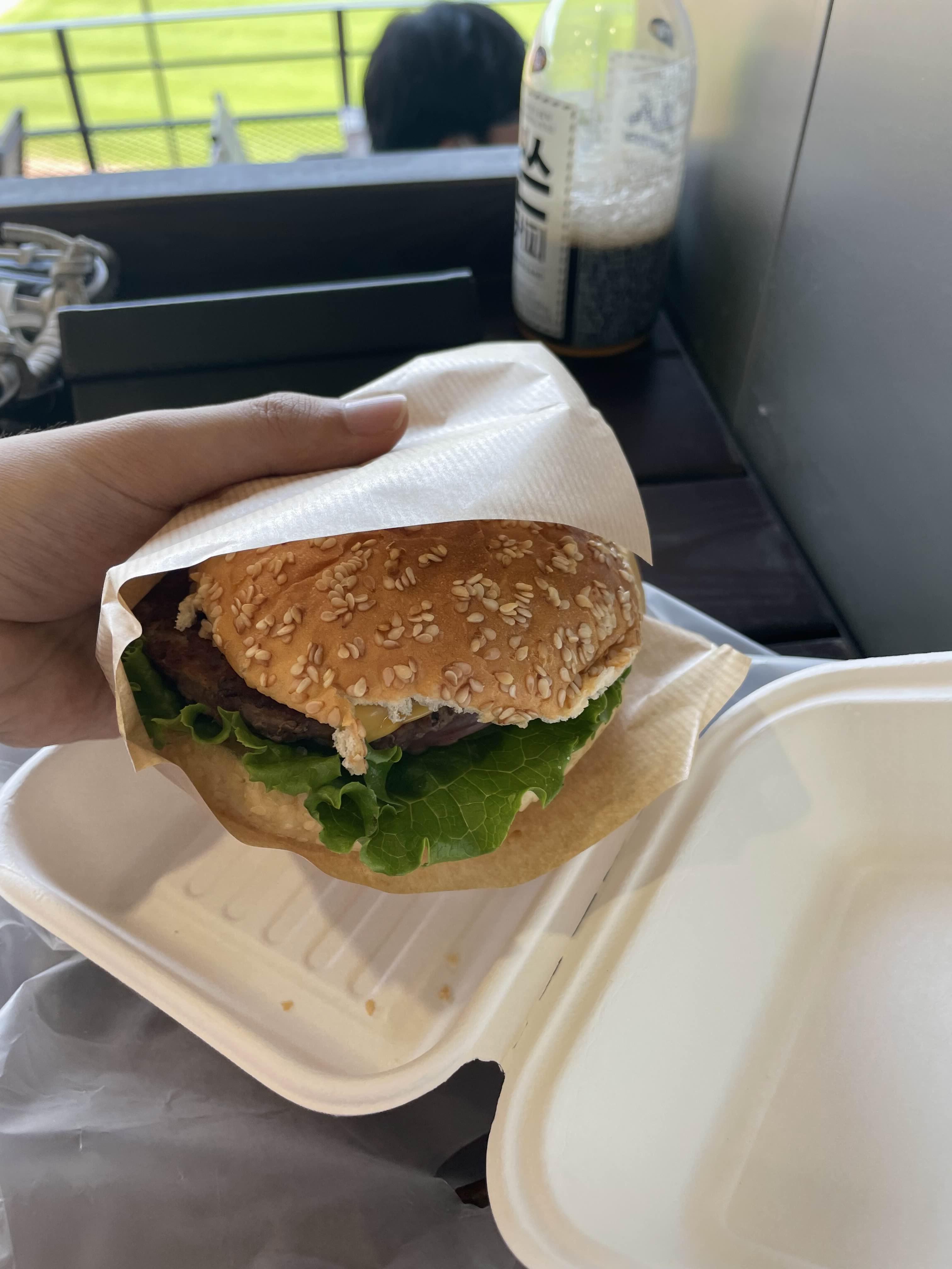 자리에 와서 바로 김병현 버거를 먹어봤다. 우린 신나게 맥주도 많이 마셔야하기 때문에 제일버거 단품만 구매했다. 맛은 이 버거가 따뜻하게 금방 나왔으면 정말 맛있었을 것 같다. 경기장에서는 미리 만들어둔 버거를 팔고 있어서 버거가 많이 식은게 아쉬웠다ㅠㅠ