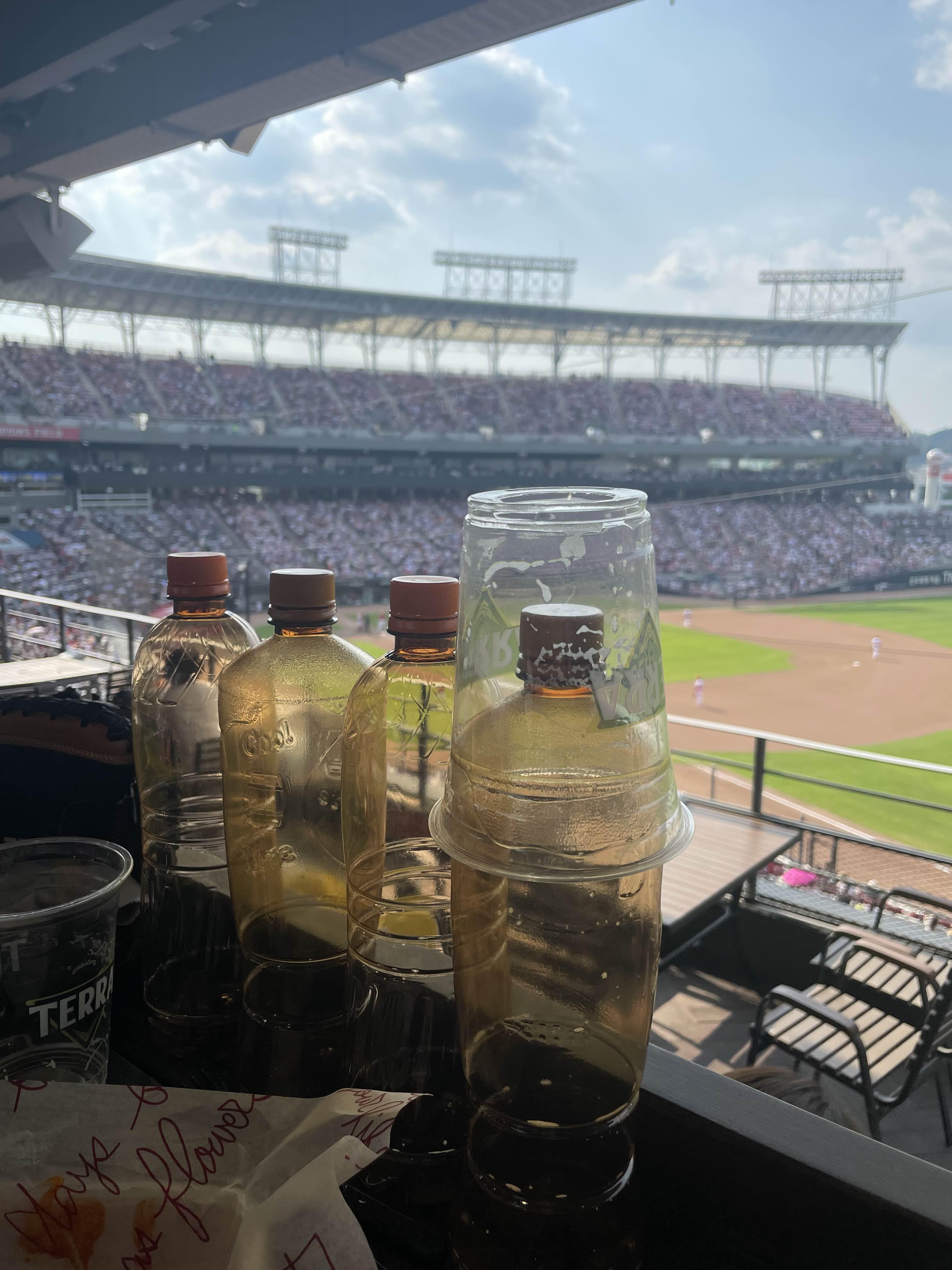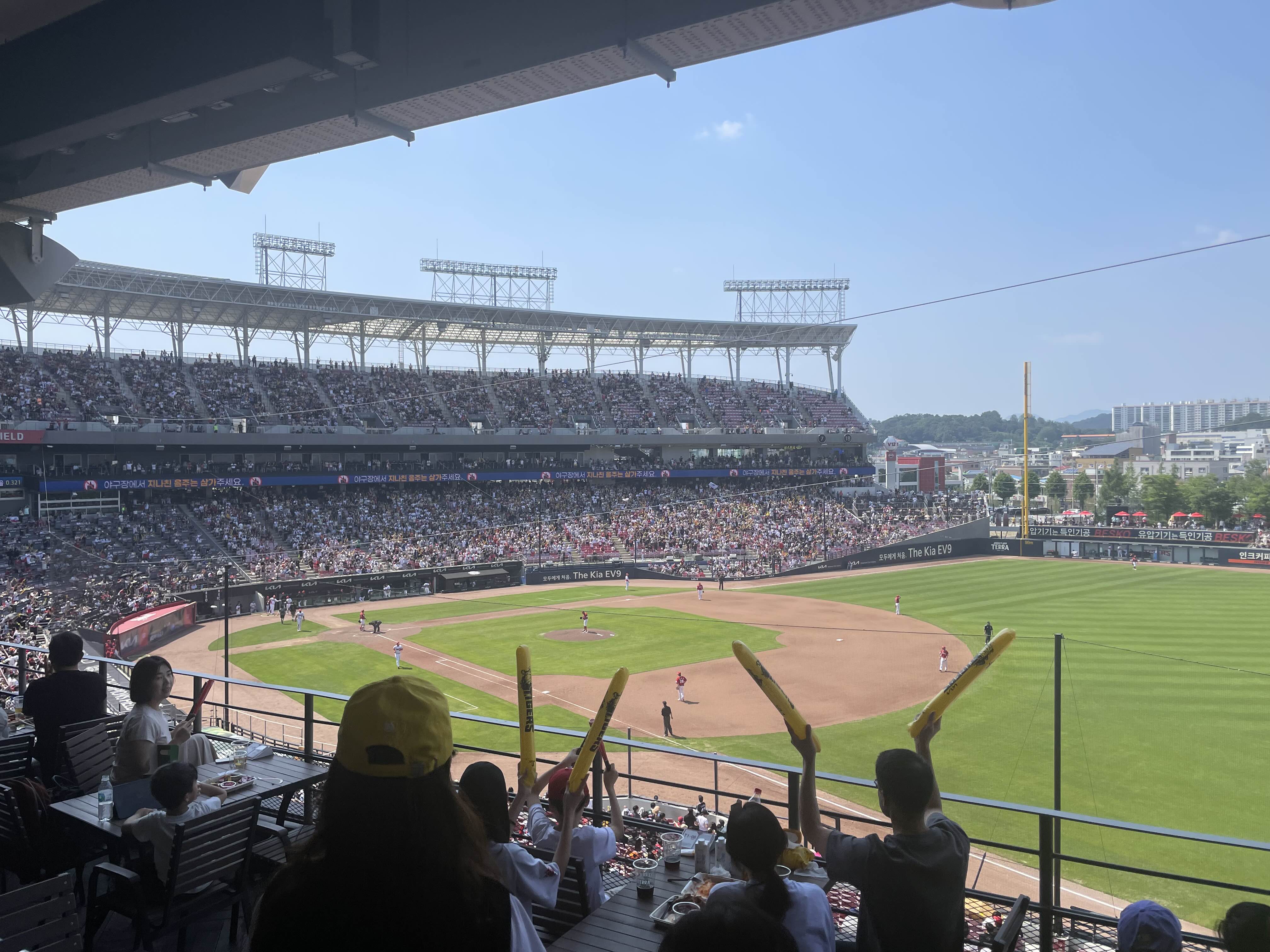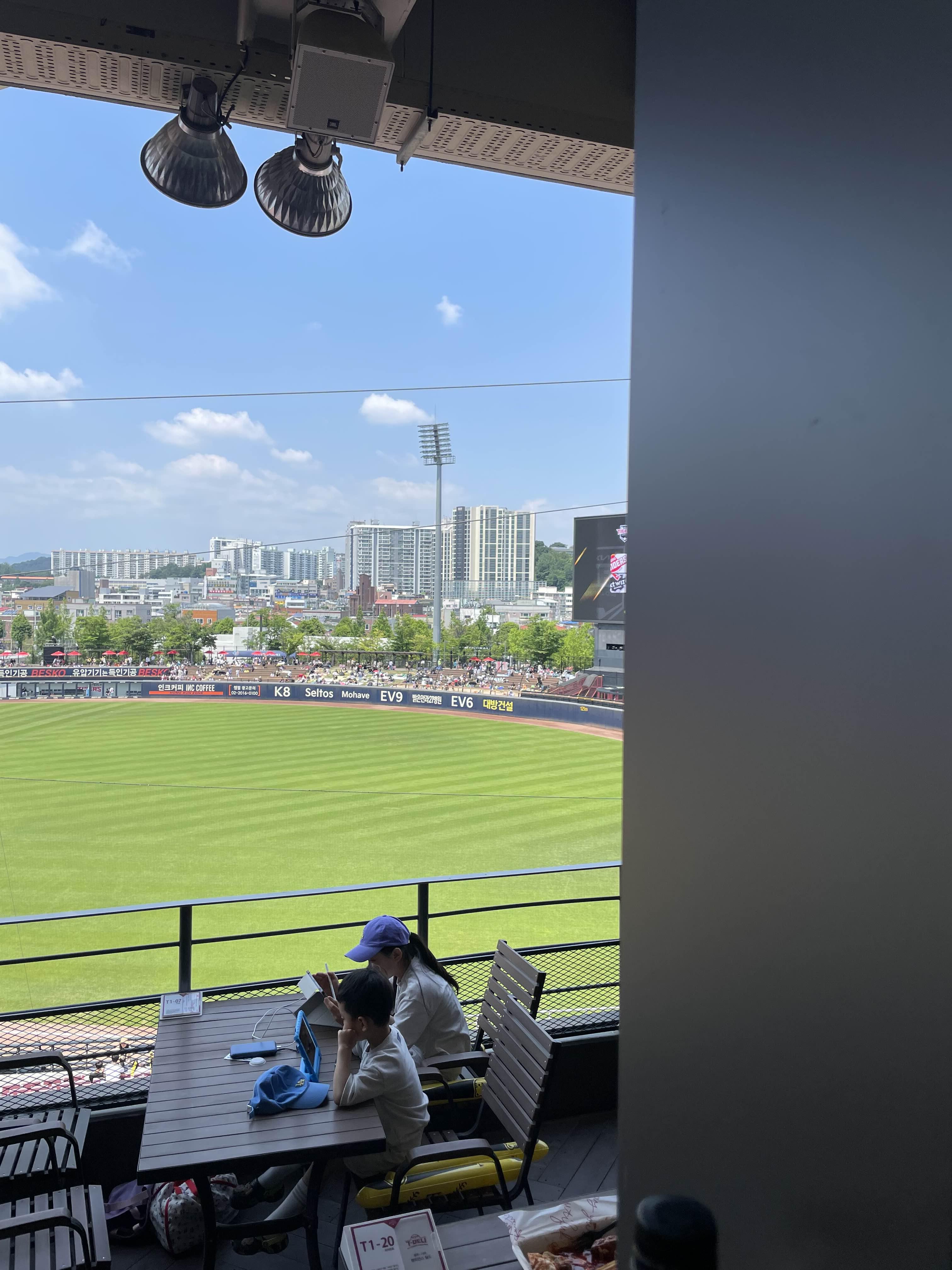 여기 좌석이 스카이박스와 이어져 있는 자리이다 보니, 생각보다 뷰도 좋았고, 홈 응원석까지 햇빛이 들어오는 낮경기임에도 쾌적하게 그늘 속에서 야구를 볼 수 있는 아주 만족스러운 자리였다.