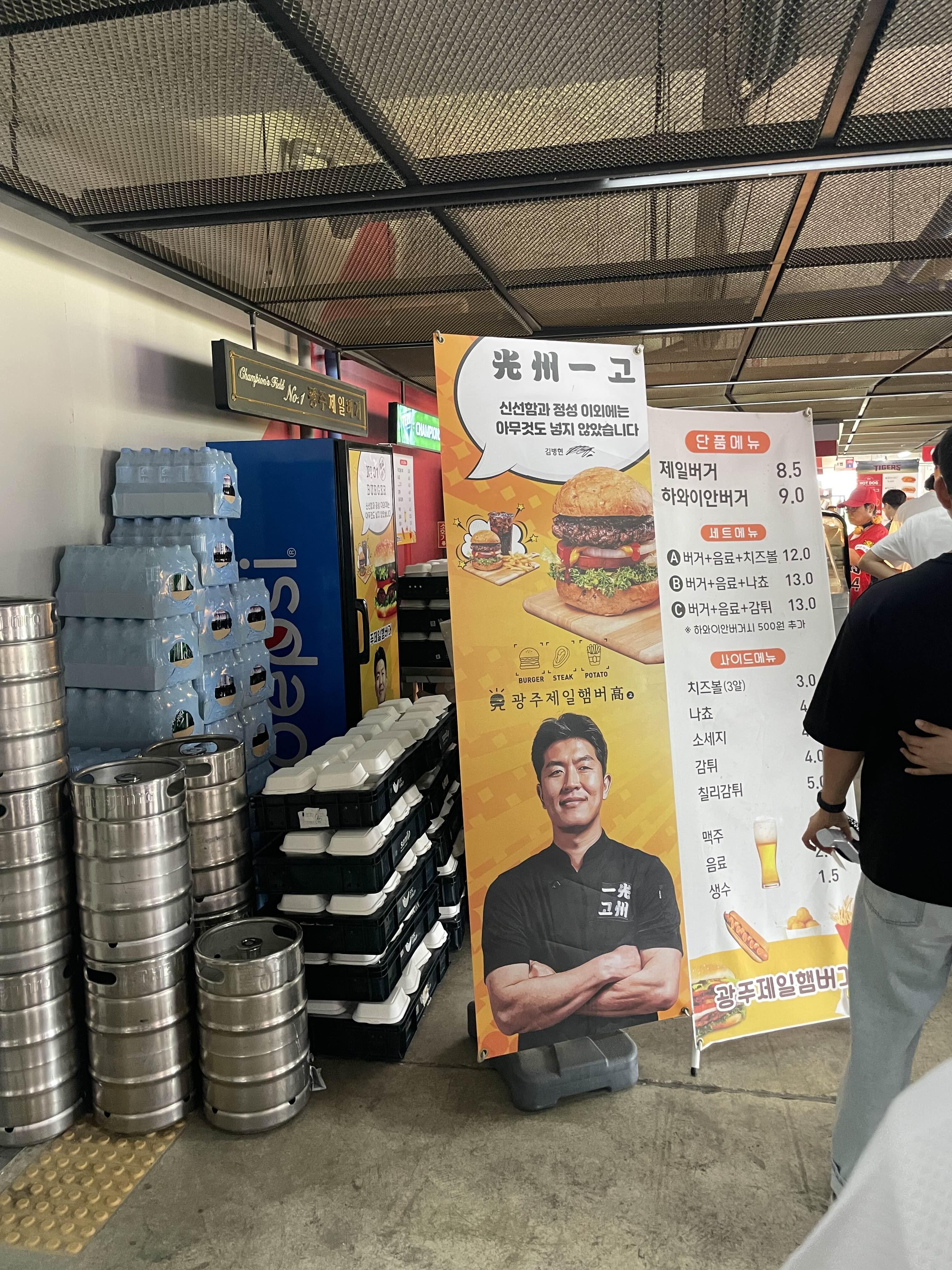 우리의 선택은 챔필 명물이라고 할 수 있는 김병현의 광주제일고버거! 위치는 3루측에서 외야방향 가장 끝 쪽에 있다. 아직 사람들이 몰리기 전이라서 비교적 줄을 오래 안 서고 구매할 수 있었다.