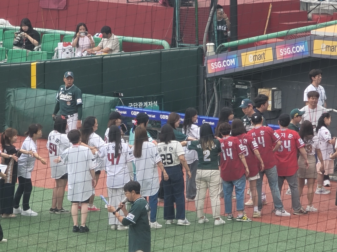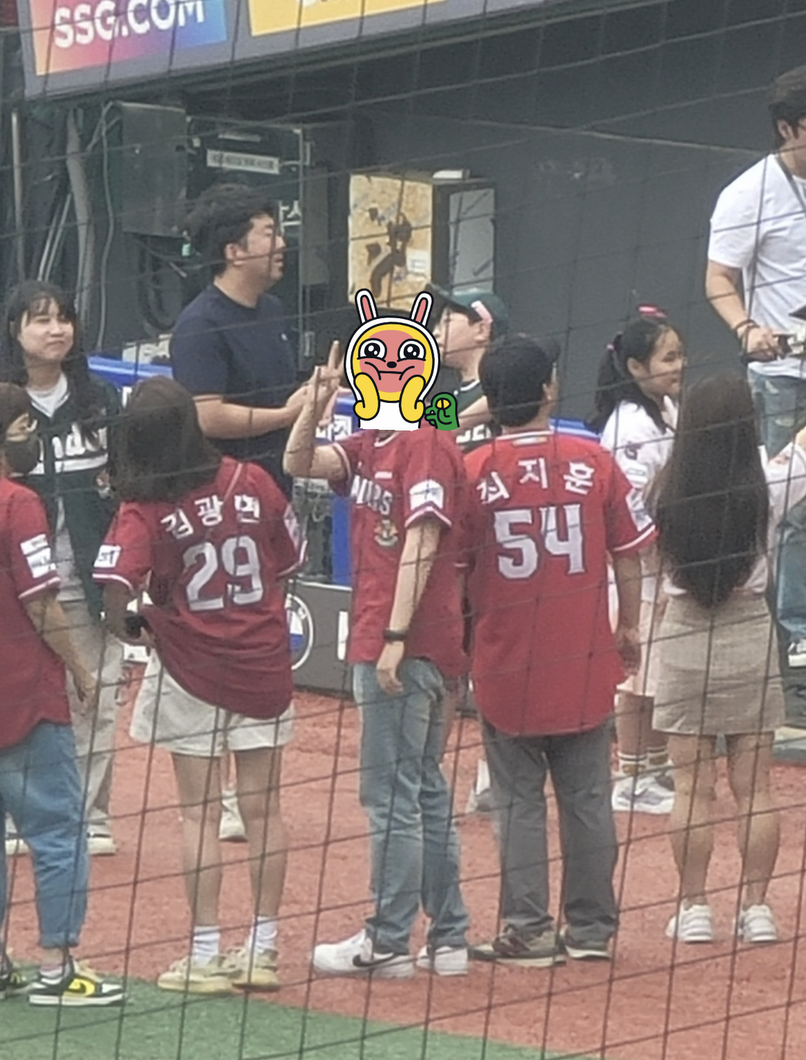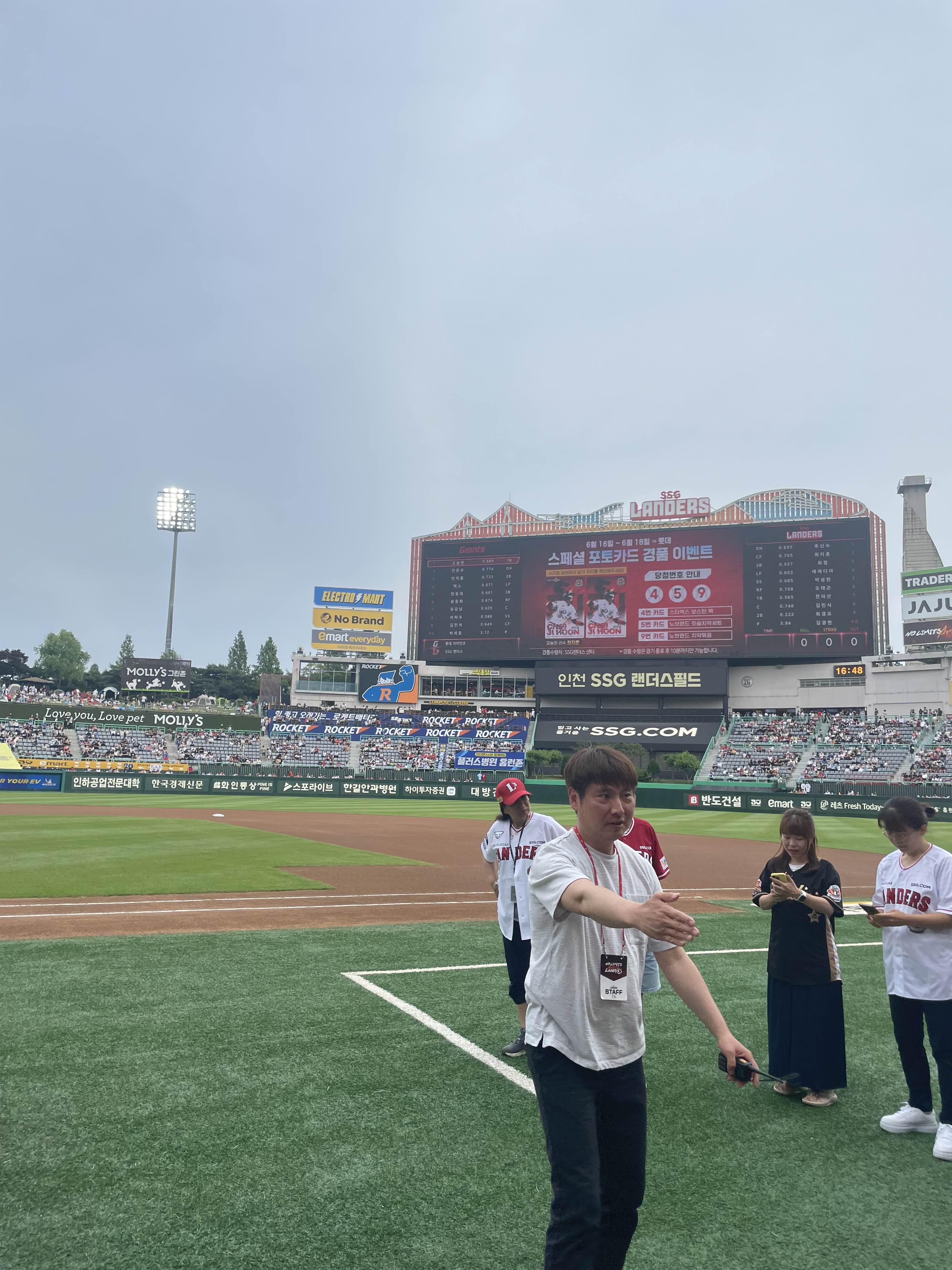 우리 일해들이 찍어준 사진, 이런식으로 선수들 입장할 때 하이파이브를 하는 자리디다.( 참고로 난 오른쪽에 모자쓰고 있는 빨간 최정 유니폼 ㅎㅎ) 개인적으로 경기 전에 저기에 서 있는 것만으로도 운동장 분위기에 압도되서 긴장이 되었다. 선수들이 참 대단하다고 생각한 부분…ㅎㅎ