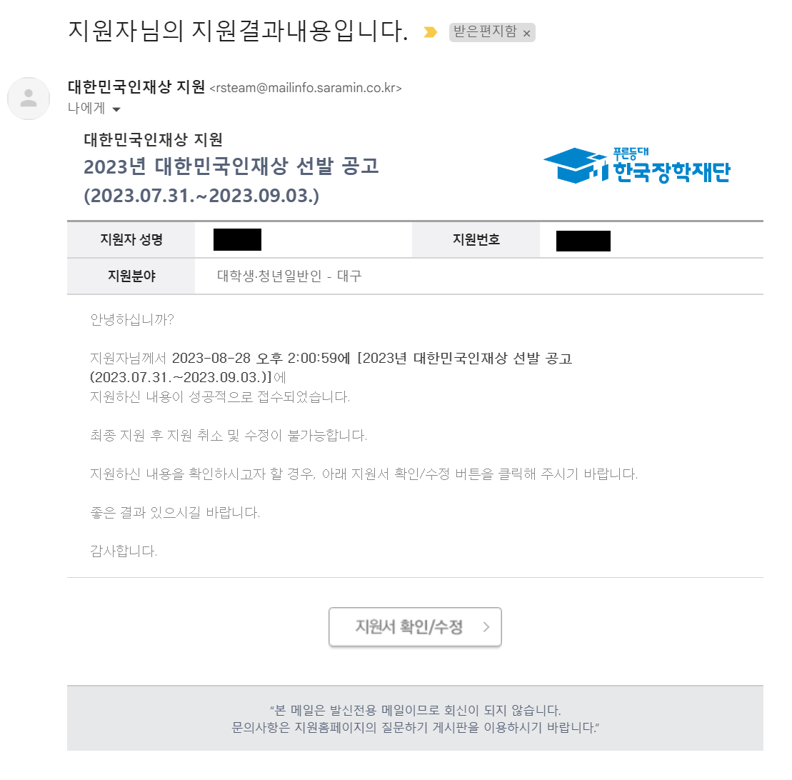 내가 원하는대로 꾸며진 추천서를 가지고 심사를 받는 것은 의미가 없다고 생각했다. 나를 가장 잘 평가해줄 수 있다고 판단한 분들께 추천서를 부탁드렸는데, 만약 그 분들이 추천서에 좋지 않은 내용을 써서 떨어졌다면 그건 애초에 상을 받을 자격이 없는 사람이었다는 것 일 것이다.