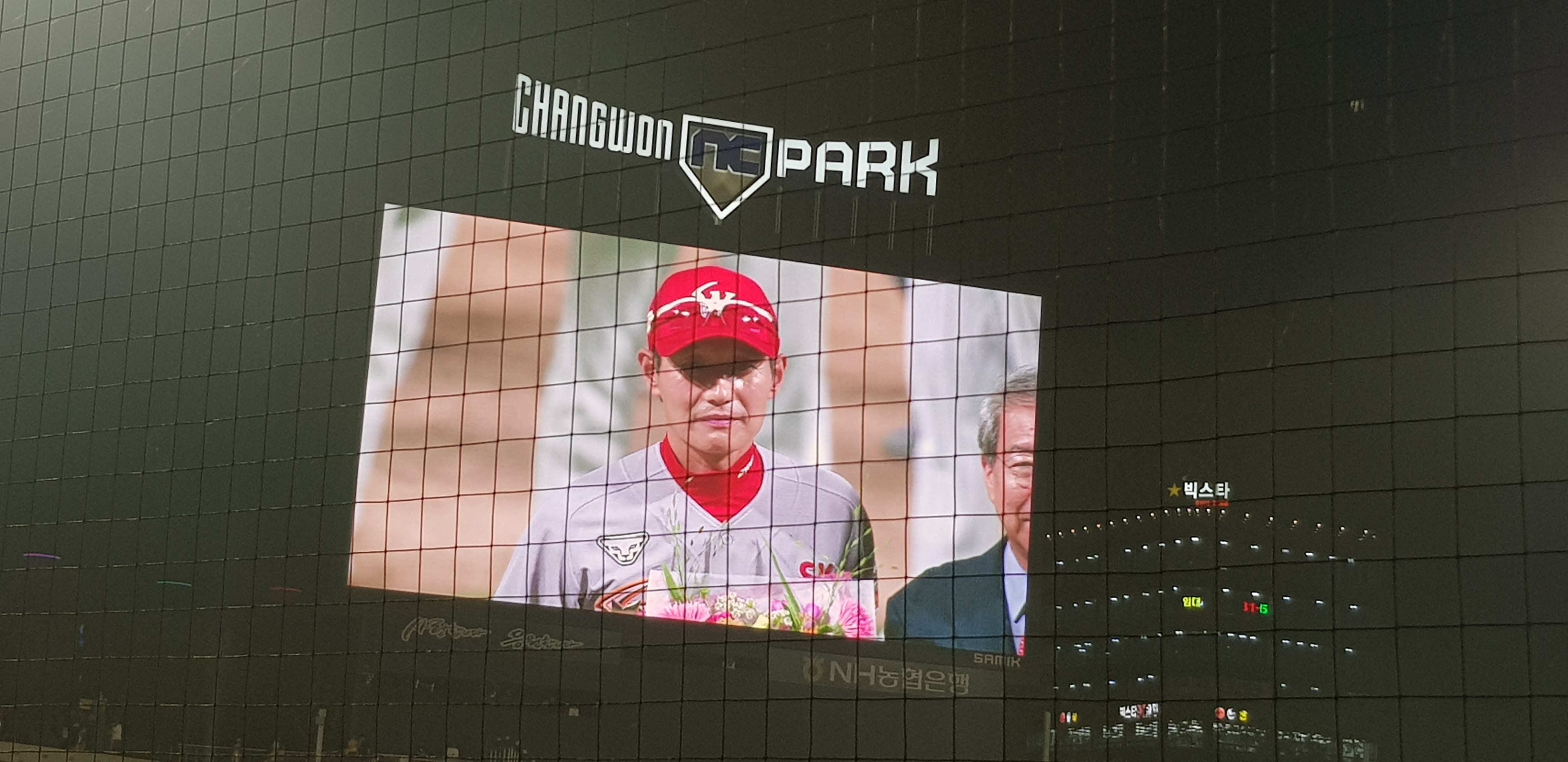 축제의 현장 답게 10개구단 팬들의 연합 응원도 많았다. 국민 응원가인 아파트에 맞춘 응원과, 들국화의 돌고, 돌고, 돌고에 맞춰서 파도타기, 그리고 빅뱅의 붉은 노을에 맞춰서 플레시 응원까지 했다. 창원NC파크 역시 조명을 LED로 써서 이 조명까지 조절을 해서 응원이 정말 멋있었다. 이걸 영상을 찍었으면 좋았을텐데 신나서 응원하다 맞다 찍을 껄 하니 이미 다 끝났었다..ㅜㅜ