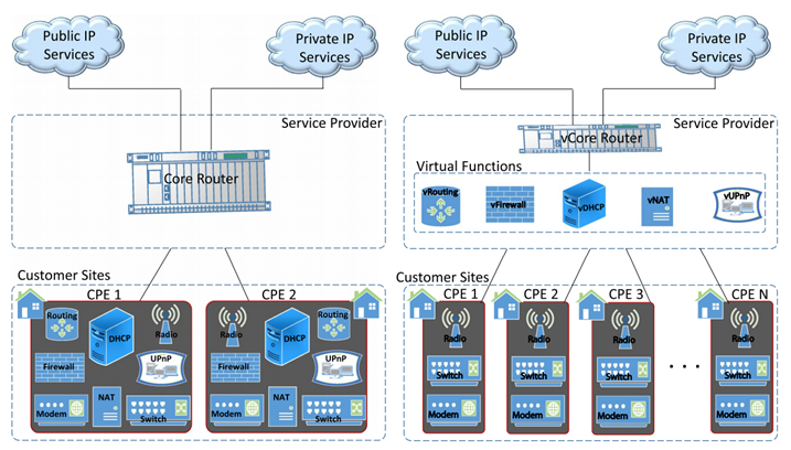 이에 반해 가상화는 공유된 물리적 망에 대해서, logical하게 가상의 망을 구성해주고, 이를 virtualized된 network function들의 chaining으로 구현을 하여, 각각의 logical한 망들이 하나의 공유된 물리망을 마치 각자 따로따로 쓰는 것 처럼 느끼게 만들어주는 개념이라고 할 수 있을 것이다.