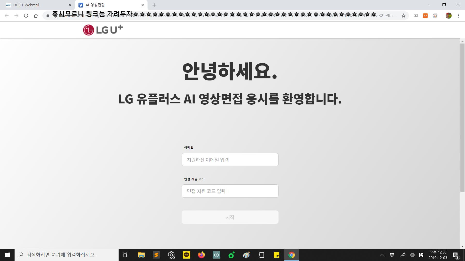 LG 유플러스에서 메일로 보내준 링크를 따라들어가면 이 페이지가 나온다. (어플도 기업용 솔루션 어플이 있긴 한데, 컴퓨터를 이용한 응시를 권장하고 있다.) 여기에 내 이메일과 LG측에서 받은 면접지원코드를 입력하면 AI면접화면으로 넘어가진다.