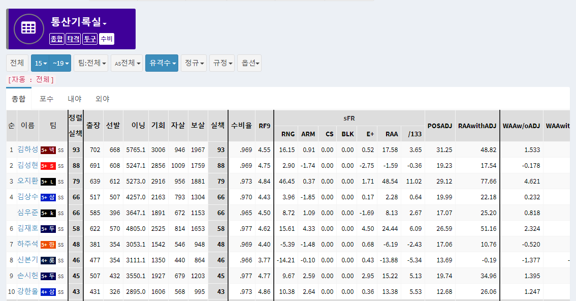 15~19 시즌 유격수 누적 실책수다. 일단 누적 실책수 3위에 오지환이 위치하고 있다. 하지만, 야구를 조금 본 사람들이라면 오지환의 엄청난 수비범위를 알 것이다. 그리고 대부분의 실책들이 이 넓은 수비범위로, 그냥 안타성 타구를 괜히 잡으려고 건드리다가 생기는 경우가 많다. 이를 수치로 보여주는 지표들 중 하나가 RAA with ADJ, 수비득점 기여 지표이다.