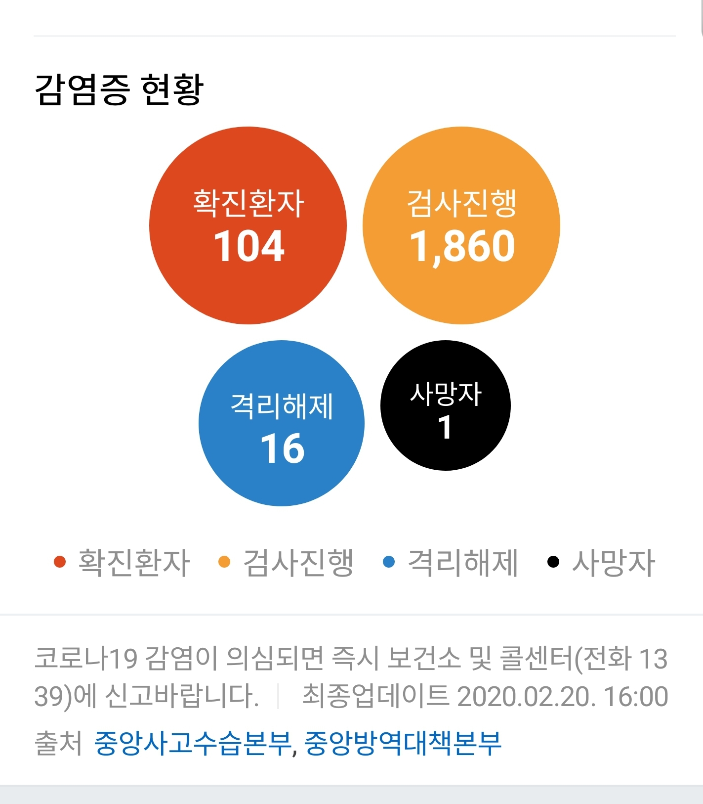 솔직히 대구 거주하면서 대구는 안전하겠지라고 생각하고 있었다. 하지만, 최근 이틀사이에 대구 경북지역에서 환자가 엄청나게 늘어나고 국내 확진자는 100명을 넘기며 사망자까지 발생했다.