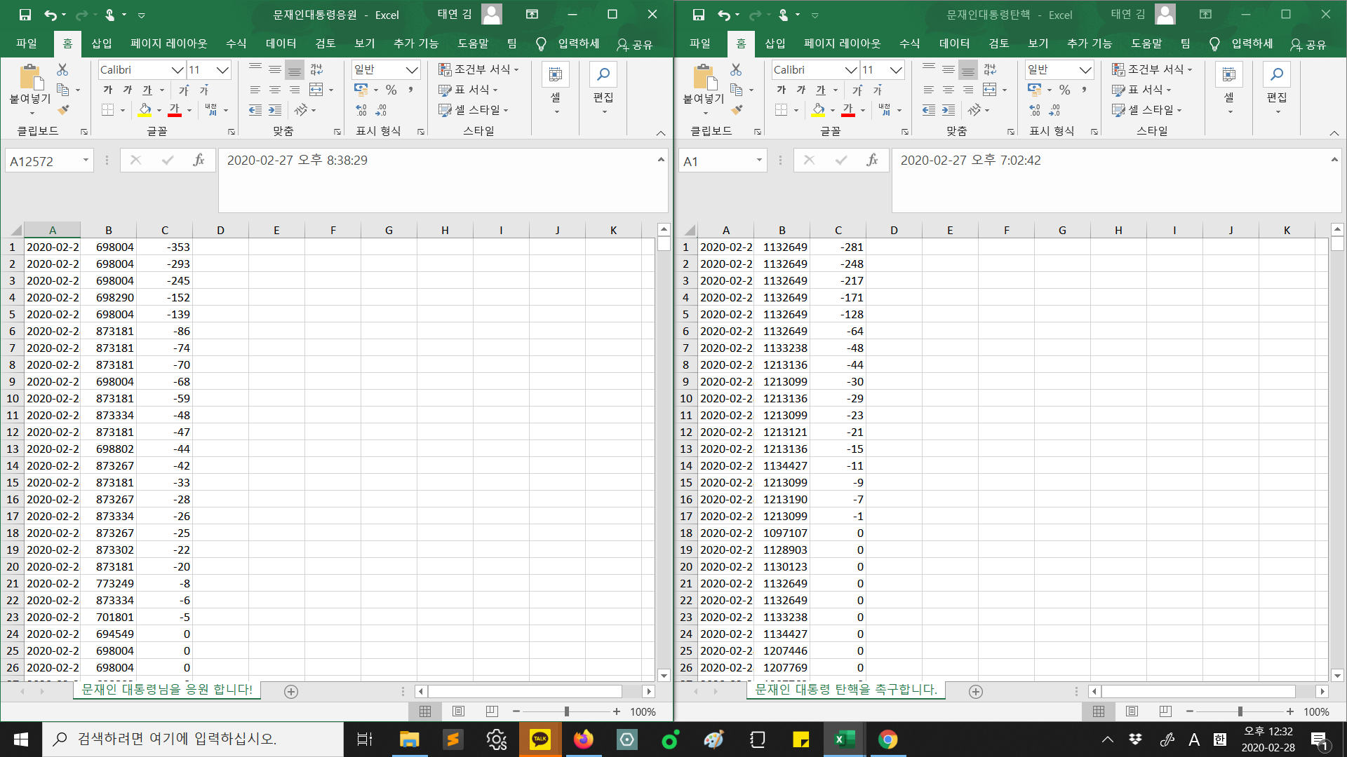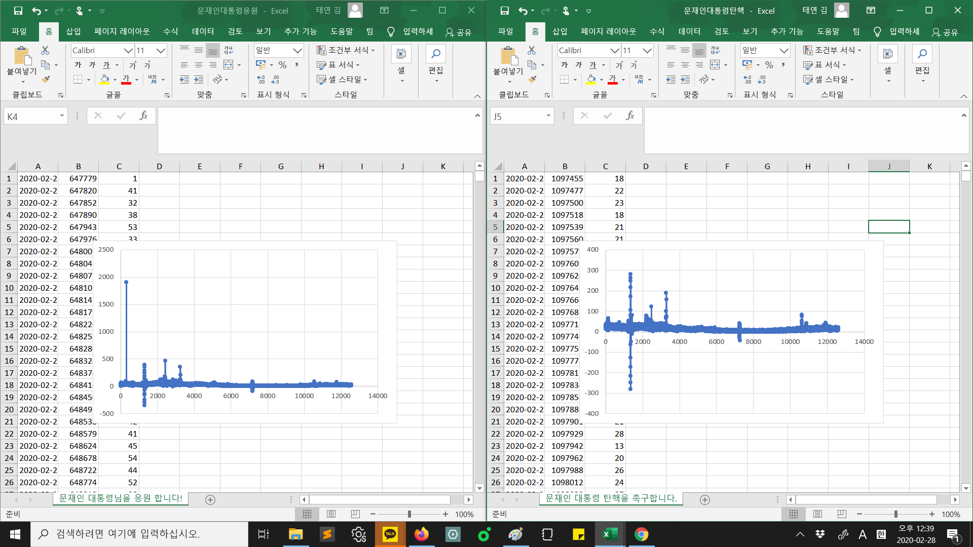 왼쪽이 문재인 대통령 응원 청원, 오른쪽이 탄핵청원이다. 간단하게 오름차순으로 정렬을 해보면, 양쪽 모두에 그 수가 줄어드는 구간이 있는 것을 확인할 수 있고, 그 감소폭은 응원청원쪽이 조금 더 커 보인다. 추측으로는 누적 청원 수를 서버에 캐싱으로 저장을 하면서 이를 일정 time slot 마다 업데이트시켜주는 방식을 것 같은데 이런 구간이 있다는 것은 캐싱 구현이 어딘가 잘못되지 않았을까 생각이 된다. 두 청원에서 그 수가 감소하는 시간이 다른 것 역시 의도적으로 누군가 개입해서 그 수를 낮춘다고 보기는 어려울 것 같다.