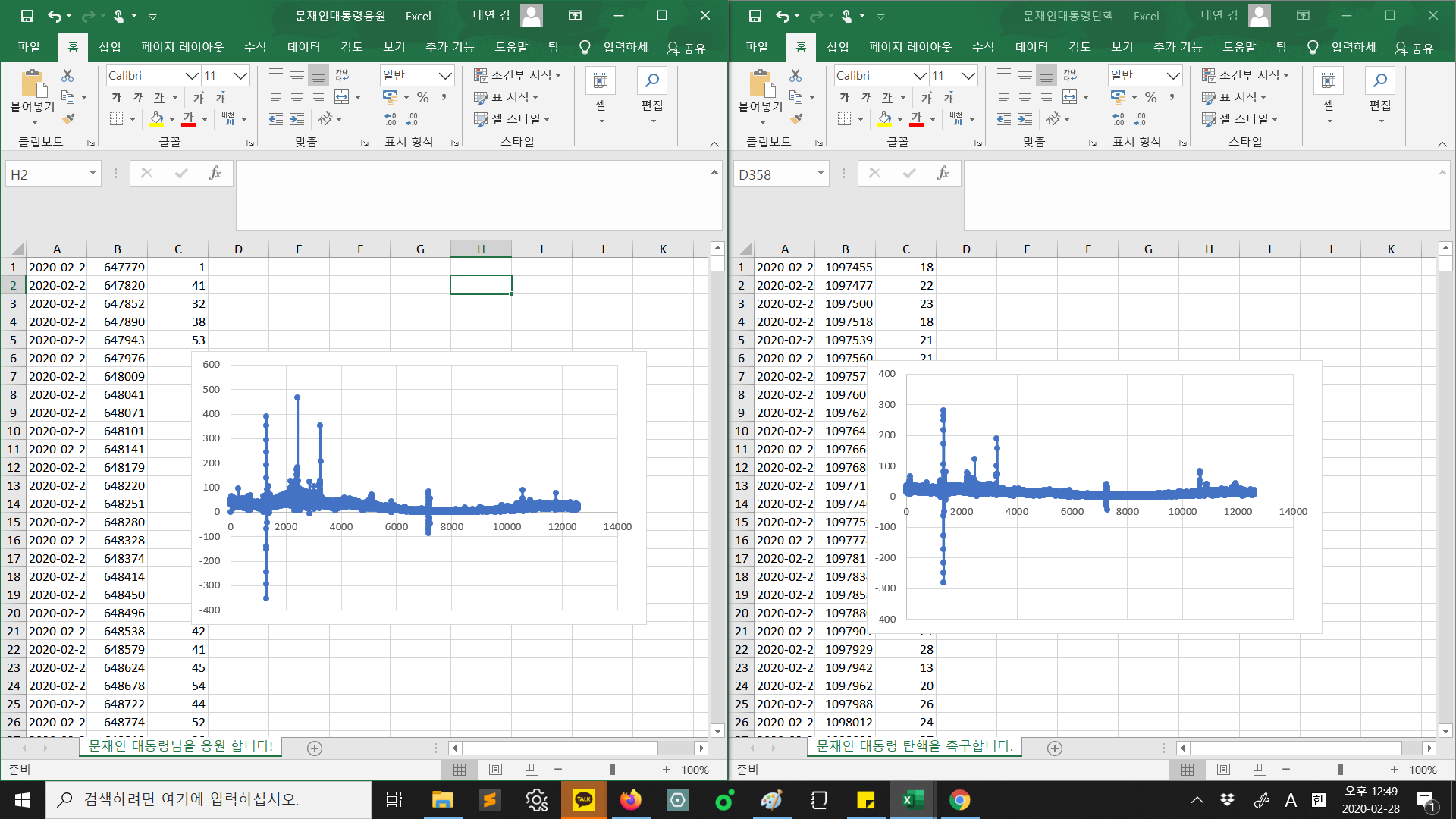 그리고 큰 폭으로 증가하는 시간대 역시 양 청원에서 거의 비슷하게 나오는 것을 볼 수 있다. 이는, 응원 청원이 탄핵청원의 맞불 격으로 올라온 것도 있기 때문에 필연적으로 이 두개의 청원은 이슈가 된다면 같이 이슈가 될 수밖에 없고, 아마 저렇게 한 번씩 peak점을 찍는 시간대에 언론에서 이에 대한 언급이 나오거나, 어느 커뮤니티에서 가짜뉴스, 또는 추측성 루머로 이슈가 된 시기가 아닐까 싶다. 이 부분은 귀찮아서 안 찾아본다. 뭐 양쪽다 같은 경향을 보이고 있기 때문에 크게 이상한 부분이라고 생각되지는 않기 때문이다.