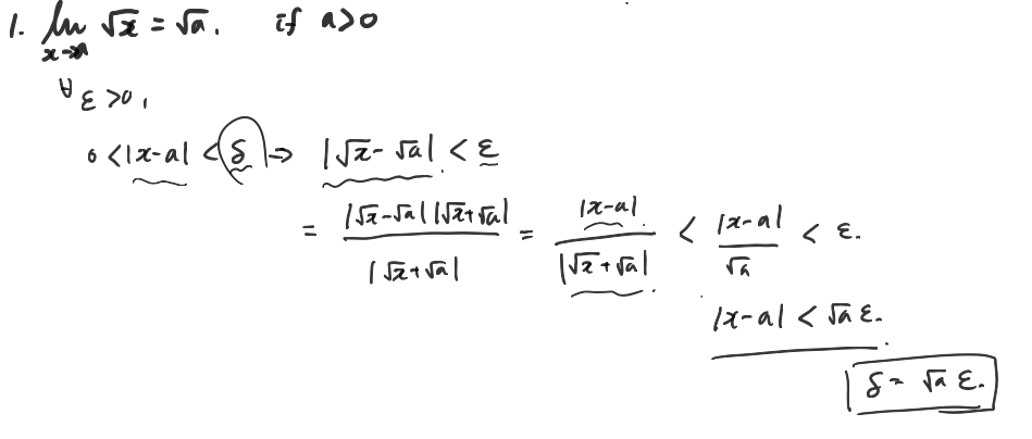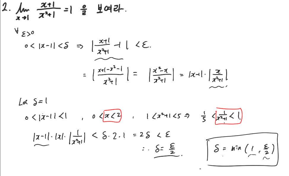 우리는 이 함수가 연속이고, 극한값이 존재한다는 것을 직관적으로 알지만, 이를 배운 입실론-델타논법으로 한 번 증명을 해보도록 하자.
