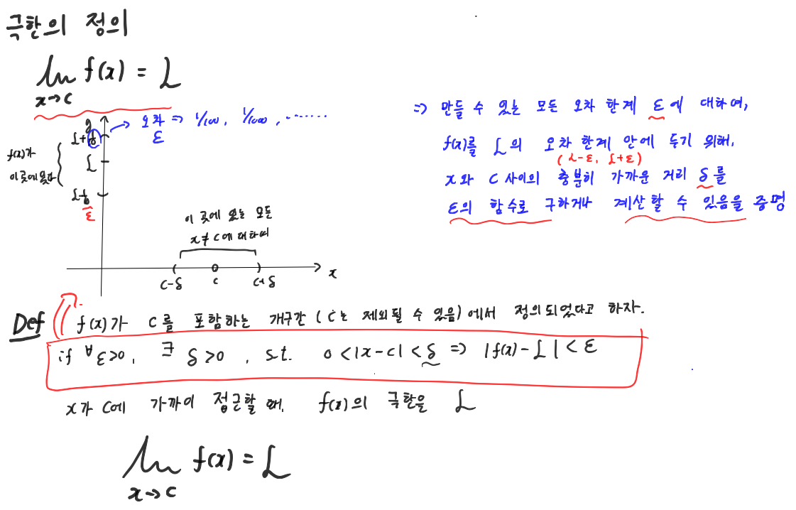 "임의의 입실론에 대하여, 0보다 큰 델타가 존재하며, 그 델타는 c를 중심으로한 델타라는 크기의 구간 안의 x에 대해 x의 함수값이 극한값 L에 대해 입실론이라는 오차한계 안에 존재한다."