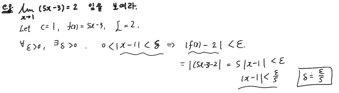 정의를 그대로 사용하기 위해, 각각 c와 f(x), L을 정의를 해주고, f(x)-L 부분을 풀어서 써주면, x-c의 꼴로 풀리게 되어, 델타가 입실론/5로 표현이 되어, 모든 입실론에 대해 델타가 존재함을 쉽게 보일 수 있다.