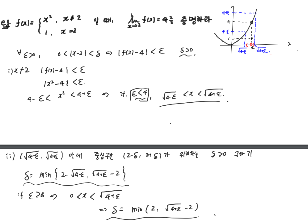 즉, 2를 중심으로 하는 (2-델타, 2+델타)의 구간이 위에서 구해준 x의 구간 안에 들어가면 되므로, 델타는 위와 같이 두 거리 사이의 최소값으로 정해질 수 있으며, 입실론이 4보다 큰 경우도 같은 방식으로 구해줄 수 있어서, 이 경우 역시 모든 입실론에 대해 델타가 입실론에 대한 함수로 표현할 수 있기 때문에 극한값이 존재함을 보일 수 있다.