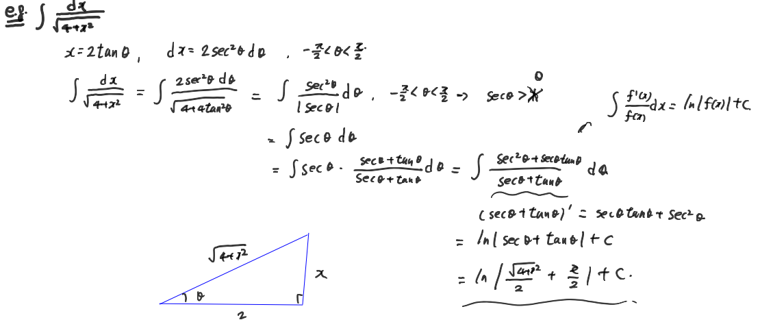 첫번째 예제의 경우는 대놓고 tan 함수로 치환하라는 꼴이고, 그대로 치환을 해서 theta의 범위를 고려해주면서 풀어주면 sec함수에 대한 적분으로 정리가 된다. 이걸 공식으로 외우는 사람도 있겠지만, 간단하게 적분을 풀어주면 ln(abs(sec(theta) + tan(theta))) + C 로 정리가 되며, 원래의 변수 x로 바꿔주기 위해 theta에 대한 단위 삼각형을 그려주어서 다시 x에 대한 식으로 표현해주어 적분 결과를 표현해준다.