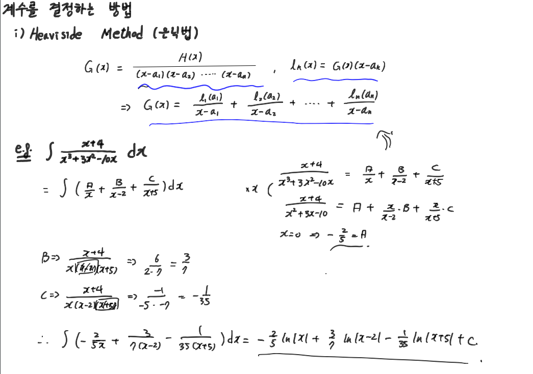 하지만, 분모의 인수들이 많아질 수록, 이 연립방정식은 복잡해지고 쉽게 해를 구하기 힘들게 될 수도 있다. 그래서 이 계수들을 쉽게 구하는 방법에 대해 소개를 하고자 한다.
