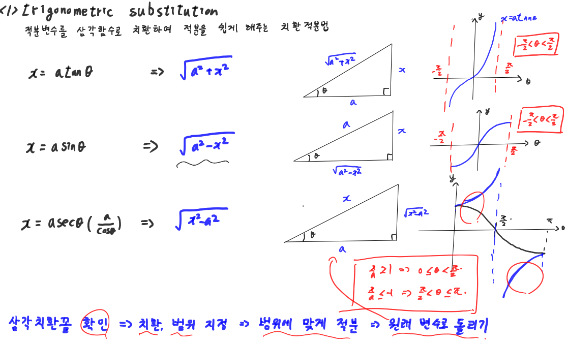 삼각치환의 경우는 간단하게 말하면, 적분변수를 삼각함수로 치환하여 적분을 쉽게 해주는 치환적분법이라고 할 수 있다. 크게 적분변수를 tan, sin, sec의 꼴로 치환을 해주는 방법이 있고, 이런 치환이 유용한 적분 꼴은 위의 그림과 같다. 또한, 치환적분을 하게 되면 중요한 것이 원래의 변수로 돌려주는 것 이기 때문에 치환해준 변수에 따라 그 변수의 범위를 잘 지정해주는 것이 중요하다고 할 수 있다.