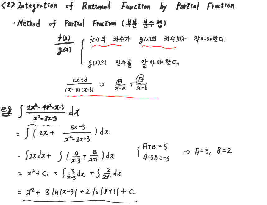 예제 문제를 보면, 일단 분자의 차수가 더 크기 때문에, 이를 큰 부분을 빼어주고 다시 표현을 해준 뒤에, 부분 분수로 표현하여 적분을 풀어주게 된다. 이때 부분 분수들의 계수 A, B는 간단하게 연립방정식을 이용해서 구해줄 수 있게 된다.