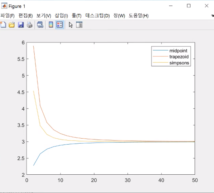 simpson의 경우는 적분의 근사값을 구할 때, 계수가 2배, 4배가 되는 부분이 계속 규칙적으로 나온다는 것을 이용해서 for문을 쓰는 대신 sum이라는 명령어를 이용해서 한 줄에 구해줄 수 있도록 구현을 했다.