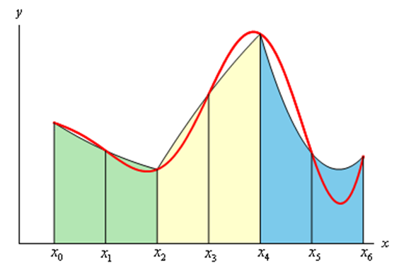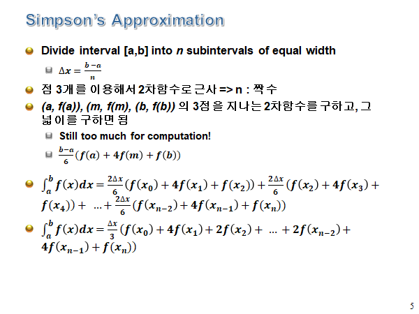 마지막은 simpson's method인데, 여기서의 핵심 아이디어는 구간에서 세점을 기준으로 하여, 점 세개가 주어지면 하나의 유일한 이차함수가 정해지기 때문에, 그 이차함수의 넓이로 근사를 시키겠다는 것이다. 하지만, 직접 매 구간마다 이차함수를 구해주고, 그 적분값을 구해주는 것 역시 꽤 많은 연산량을 요구하게 되는데, 이 적분값이 위의 그림과 같이 각 함수값들의 선형합 꼴로 표현이 된다는 것이 증명되어 이 근사방법 역시 비교적 쉽게 구할 수 있게 되어 많이 사용되는 근사방법 중 하나이다.