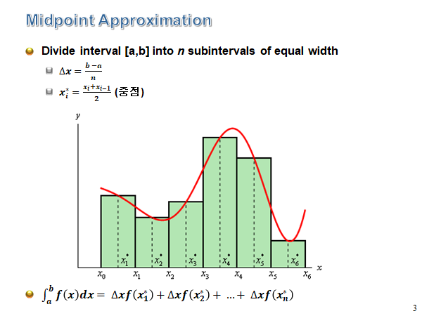 가장 많이 접해본 근사 방법일 것 같다. 적분구간 [a,b]를 n개의 구간으로 나눈다고 할 때, 하나의 작은 직사각형을 중앙값의 함수값으로 근사를 해주어서 구하는 방법이다.