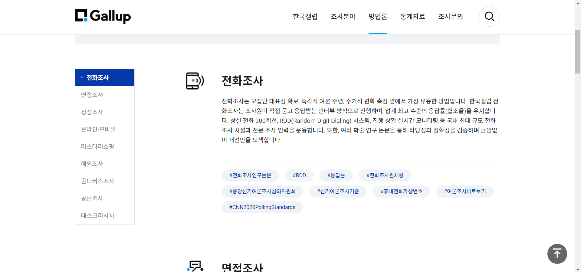 한국갤럽에서는 자신들이 시행하고 있는 조사 방법들을 모두 다 간단하게 소개하고 있다. 전화조사, 면접조사, 정성조사, 온라인모바일 조사, 미스터리쇼핑, 해외조사, 옴니버스 조사, 공론조사, 데스크리서치가 있었는데, 대부분 우리가 정치적으로 접하게 되고 경험해본 조사는 전화조사이기 때문에, 전화조사에 대해서 조금 더 알아봤다.