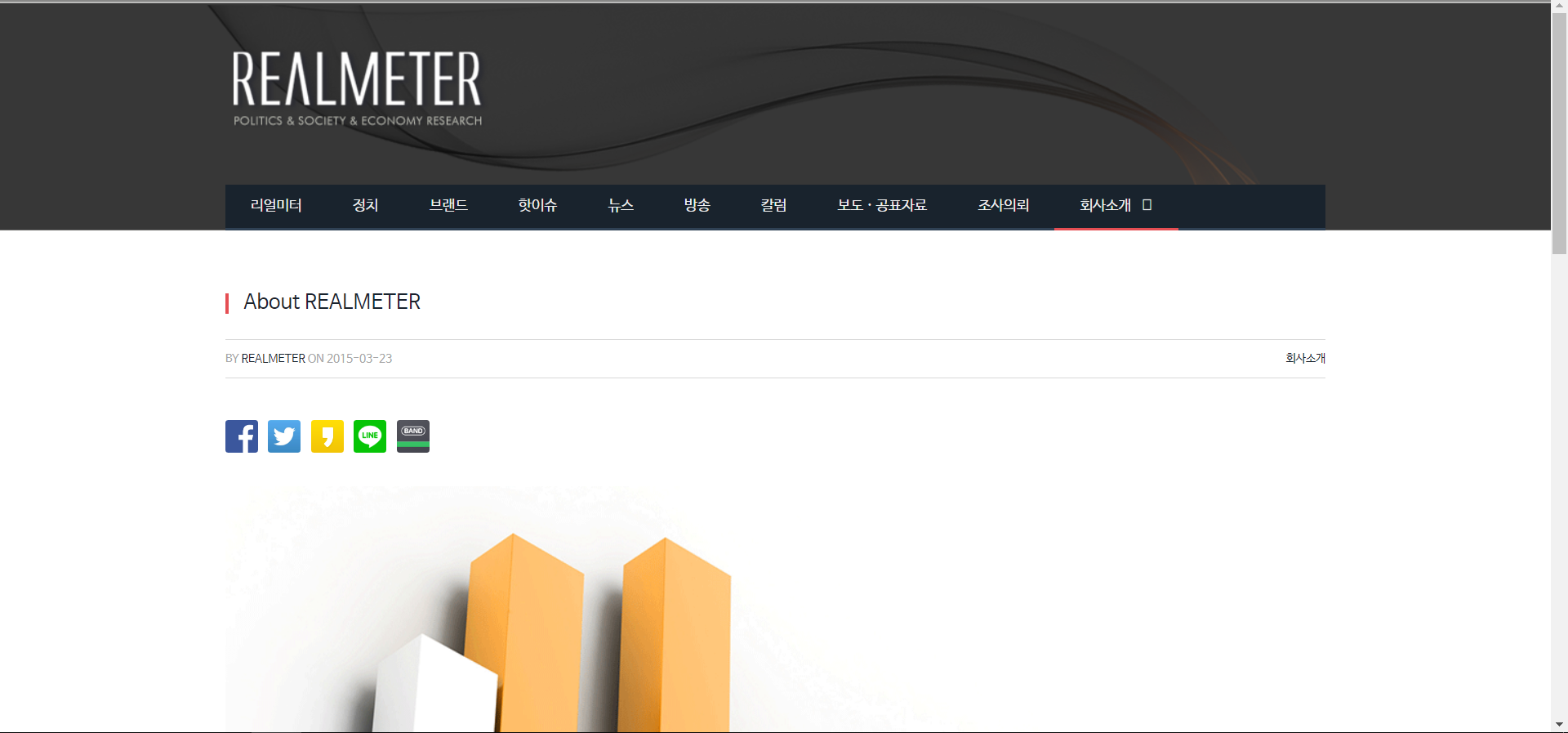 내가 못 찾는건지.... 리얼미터 홈페이지에는 자신들이 한 여론조사 결과 보도자료들만으로 가득하다. 리얼미터 배너로 있는 홈에도 보도자료들 링크로만 가득하고, 그나마 회사소개 베너에 About REALMETER라고 있는데, 여기에도 여론조사 방법에 대한 소개는 없고, 그냥 우리는 정치적 유불리에 따라 정당들이 필요한 시기에만 결과를 발표하지 않겠다 등과 같은 뻔한 얘기들로 가득하다.
