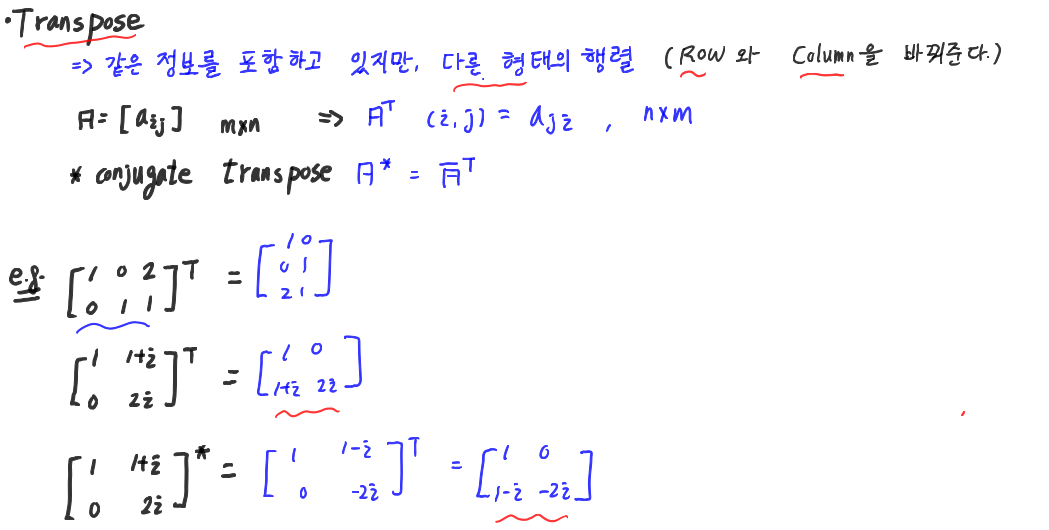Transpose는 기본적으로, 같은 정보를 포함하고 있지만 다른 형태의 행렬을 만들어주는 작업이다. 그 방법은 행렬의 행과 열을 바꿔주는 것으로 정의가 된다. 특수하게 complex number(복소수)의 경우에서는 conjugate transpose가 켤레복소수의 전치행렬로 정의가 된다.