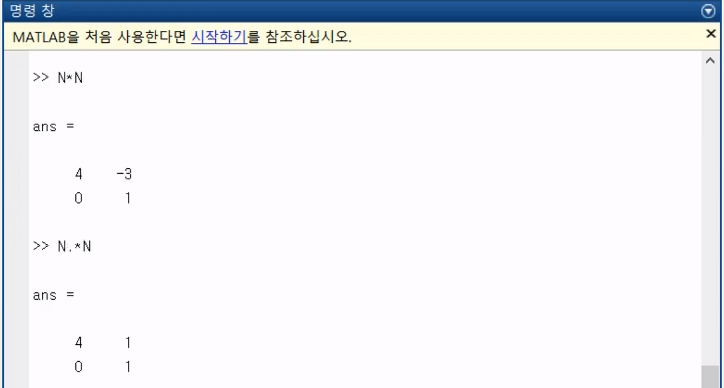 매트랩에서는 곱하기 연산을 기본적으로 행렬곱으로 정의를 해주고 있다. 하지만, 때에 따라서 우리는 각 행렬의 성분들을 곱한 결과를 구해주고 싶을 수도 있다. 이 경우에는 연산자 앞에 .을 붙여서 해주면 행렬들의 성분끼리만 계산을 해준 결과가 나온다.