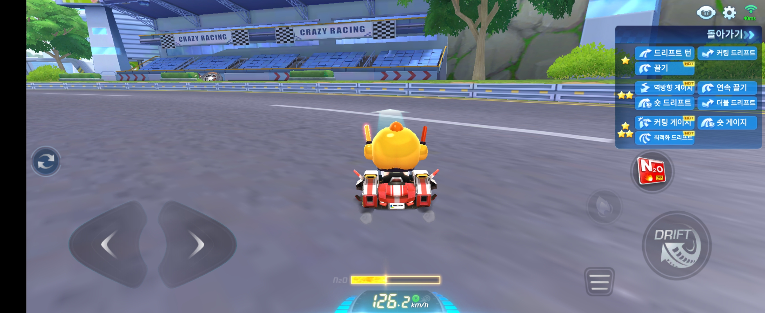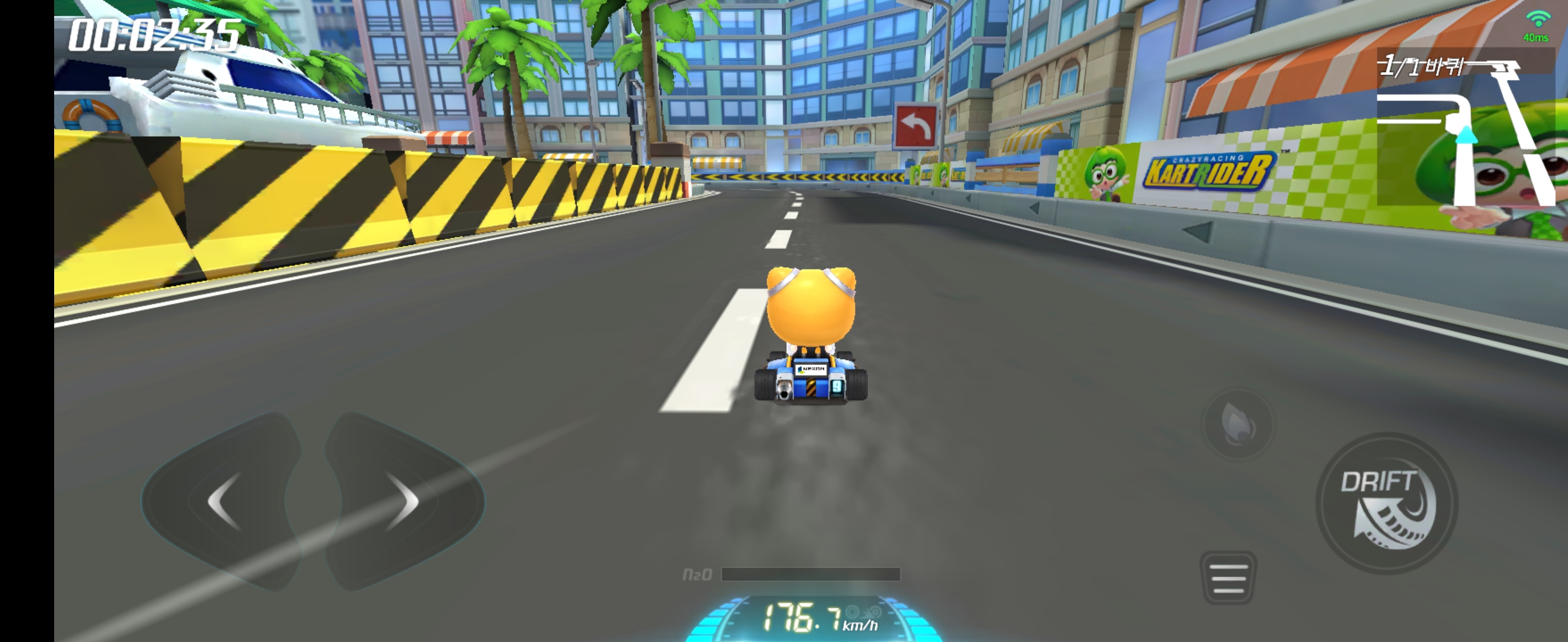 인플레이 화면인데, 일단은 기본적으로 자동으로 전진키가 눌린듯한 효과이며, 드리프트 옆에 작게 브레이크 버튼이 있어서 이를 통해 속도조절이 되며, 후진도 가능하다. 드리프트 방식은 카트와 똑같고, 커팅, 뉴커팅 비슷하게 비틀기 드리프트도 가능하다. 또한 순간부스터는 앞키가 없기 때문에 드리프트를 하면 브레이크위에 작은 부스터같은 버튼이 활성화되며 이걸 쓰면 순간부스터가 나가는 시스템이다.