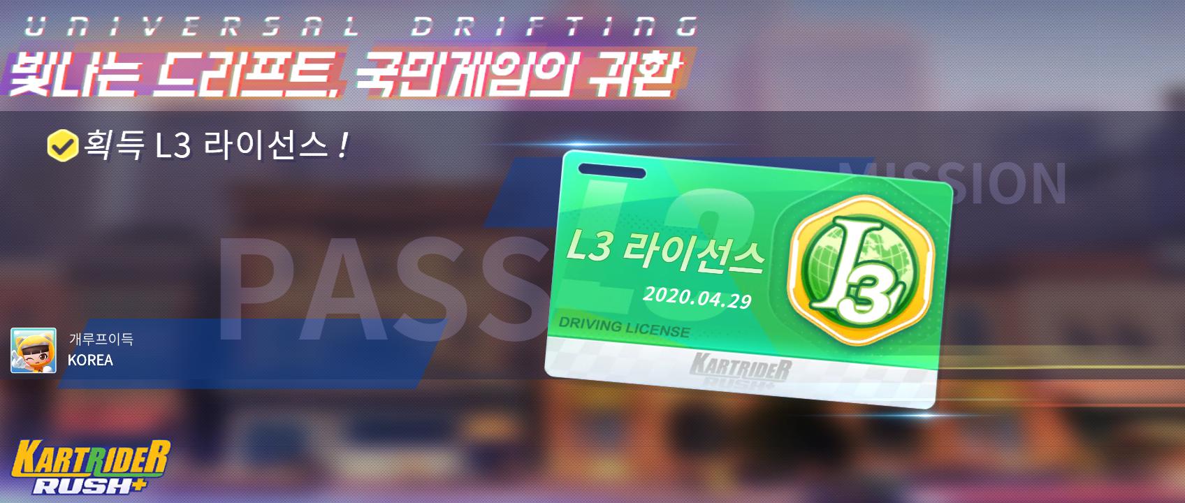 그리고 마지막으로 L3까지 라이센스를 땄다. 라이센스는 미션자체는 PC카트와 똑같고 시간만 조금 조절이 되고, 카트 기술들을 수집하기 때문에 클리어 조건에 카트 기술 몇 회이상 수행과 같은 조건이 추가되어있다.