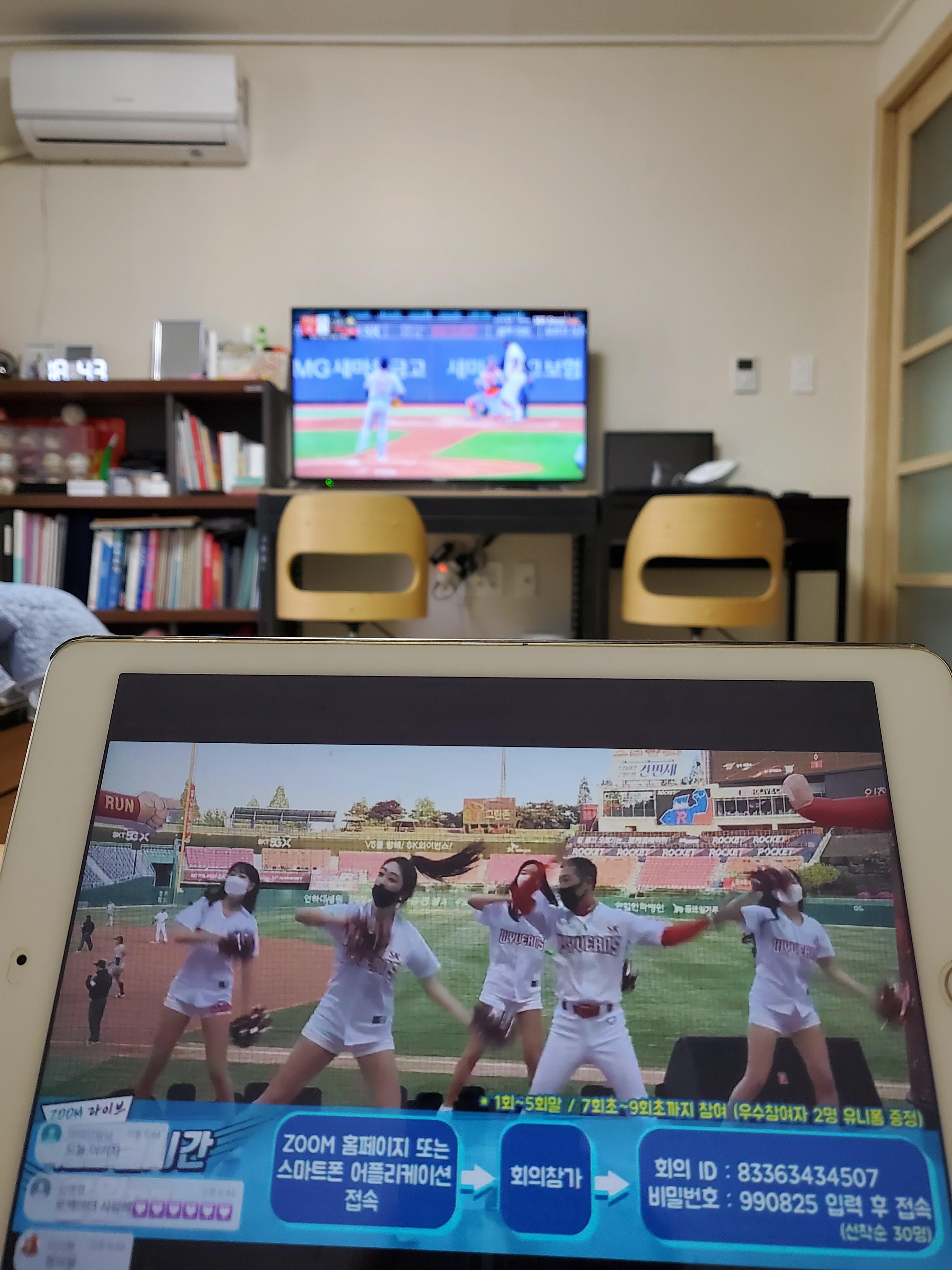 각잡고 집관을 하기 위한 세팅이다. TV로 중계를 보고, 그나마 직관의 기분을 내기 위해 아이패드로 응원단 라이브방송을 본다. 재미있었던 것은 어제 볼 때는 응원단 라이브가 딜레이가 조금 있어서 두 중계의 싱크가 안 맞았었는데, 오늘은 유튜브 라이브가 오히려 더 빨랐다. 음.... 어떻게 TV중계보다 더 저지연으로 전송을 해주는건지... 이게 바로 5G 세상인가....