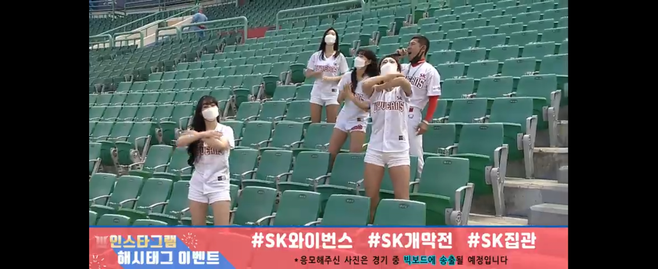 SK 와이번스의 경우는 홈경기에 응원단을 정상파견하고 응원가 음원에도 현장음을 같이 넣어서 틀어주고 있다. 그리고 원격수업에 많이 쓰는 플랫폼인 ZOOM을 이용해 빅보드에 직접 집관하는 팬들을 소환하기도 하고, 응원팀 라이브를 유튜브를 통해 제공하고있다.