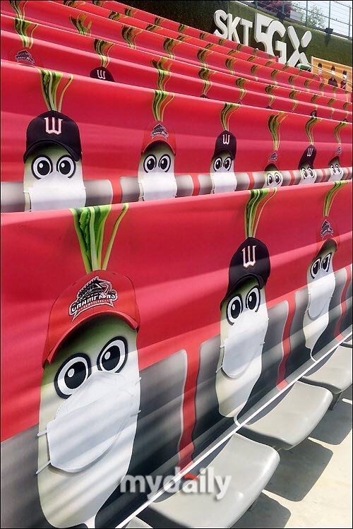 외야 스텐드에는 마스크를 쓴 팬들의 사진과 "무"관중 (엌ㅋㅋㅋㅋㅋㅋㅋ) 캐릭터의 현수막으로 채워놨다.