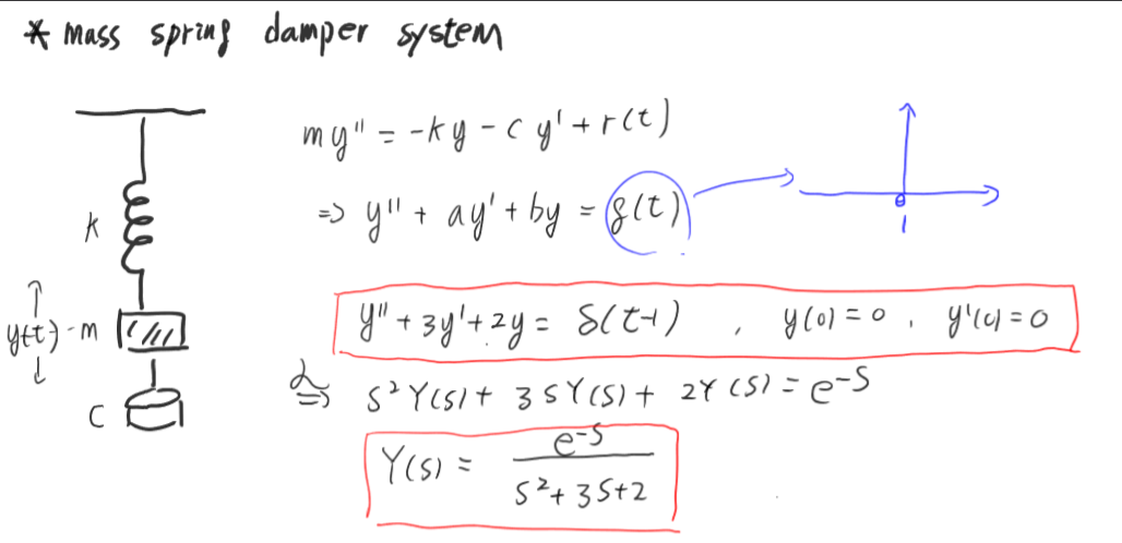 이를 위한 예제로는, 매우 간단하게 모델링이 된 mass spring damper system에 대해서 풀어주었고, input은 x축으로 1만큼 shift된 delta function으로 주었다. 우리는 위의 그림에서의 이계미분방정식의 해를 정확히 구해주지는 않았고, 다만 이를 라플라스 변환을 시켜주어서 s-domain에서 정리를 해주었다.