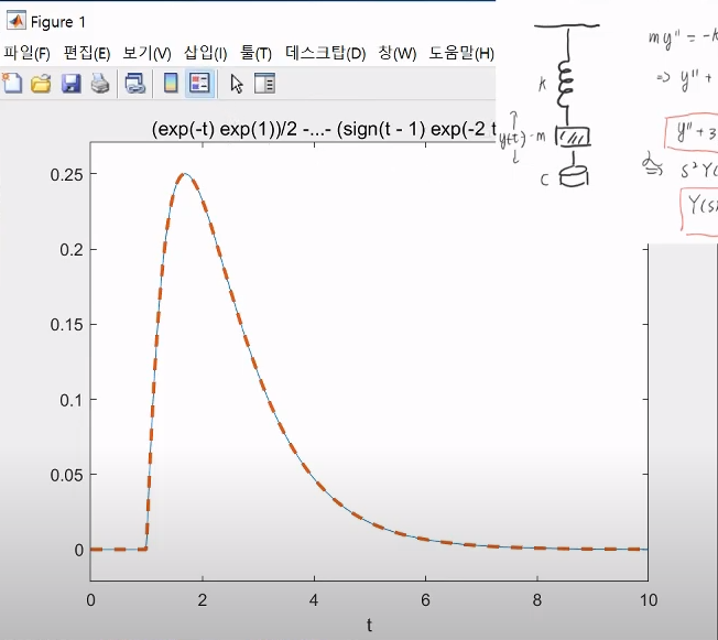 코드는 우리가 쉽게 laplace 변환을 통해 s-domain에서 식을 정리해줄 수 있기 떄문에 이를 역변환하여 시간축에서의 미분 방정식의 해를 구해주고, 이를 matlab 내장 함수인 dsolve()명령어를 통해 직접 미분 방정식을 풀어서 구해준 결과와 비교해주었다.