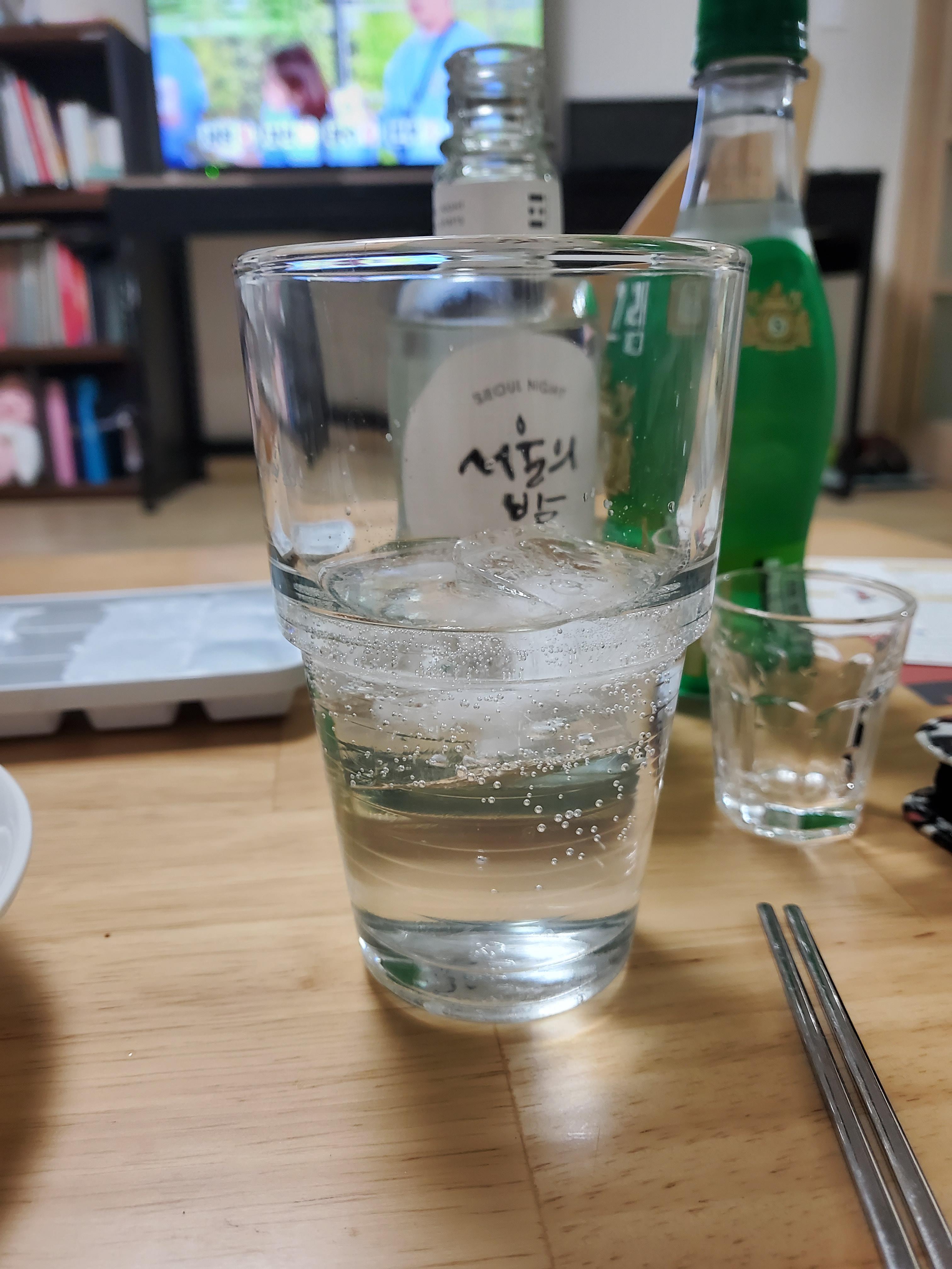 서울의 밤과 토닉워터를 약 1대 2.5 정도의 비율로 섞었고, 레몬따위는 없어서 생략했다.