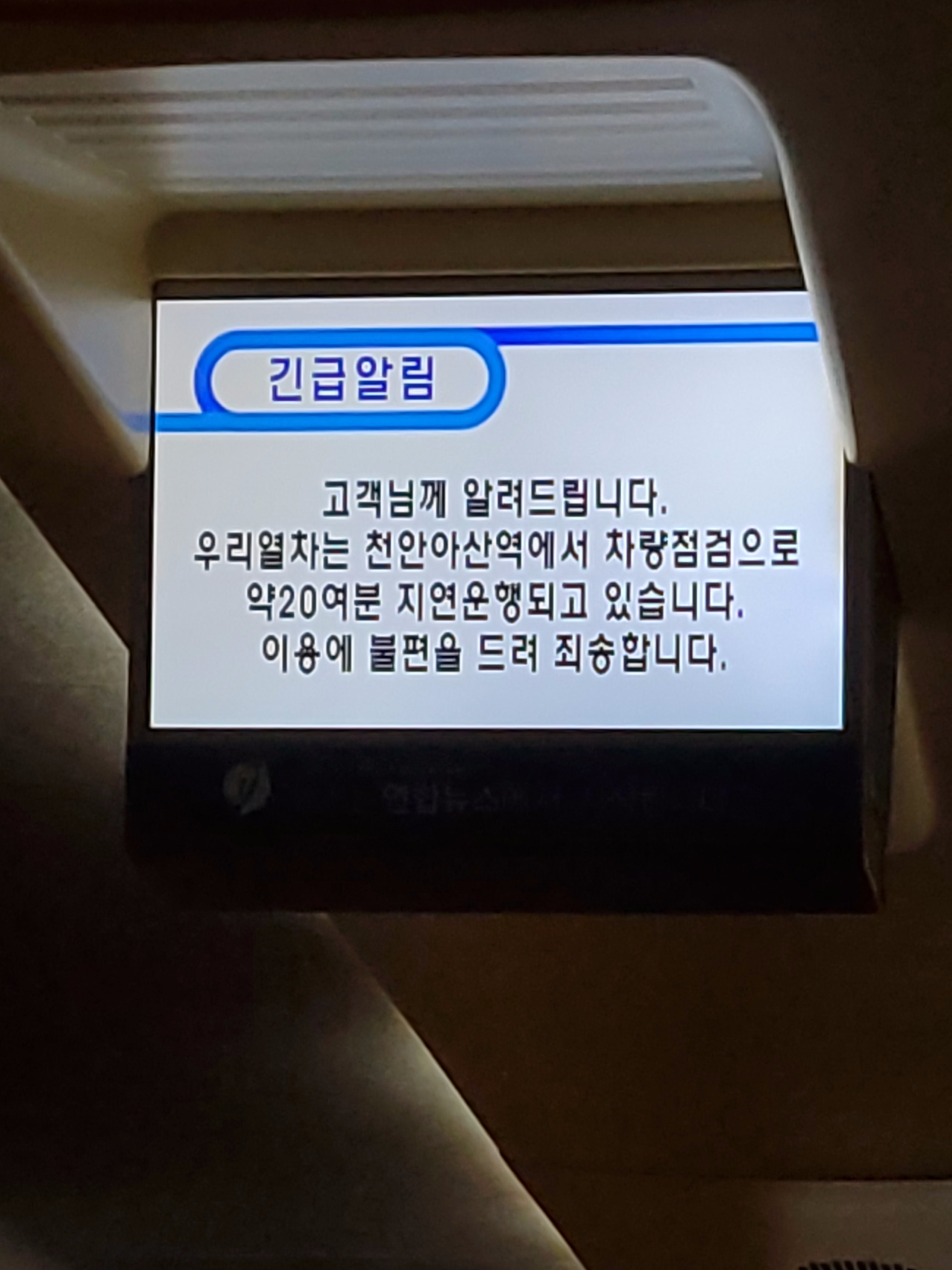 내가 탄 KTX는 천안아산역에 도착을 하고 무슨 일인지 출발을 하지 않고 있었다. 방송으로도 정확한 상황이나 얼마나 걸릴지에 대한 안내는 없이 계속 차량 정비로 지연중이라고만 방송이 나왔다.