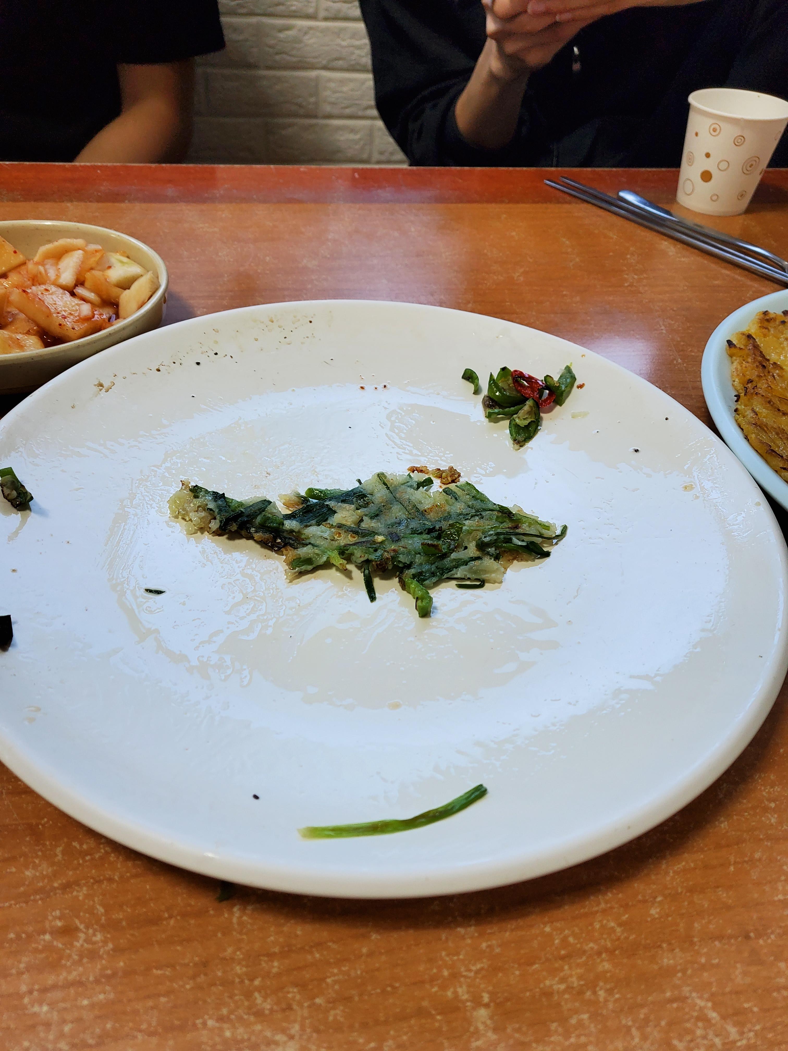 다들 너무 배고파서... 부추전 이었던 것의 사진이다. 나오자마자 허겁지겁 먹느라 사진을 깜빡했다. 땡초가 들어가있어서 매콤한 맛이 일품이었다.