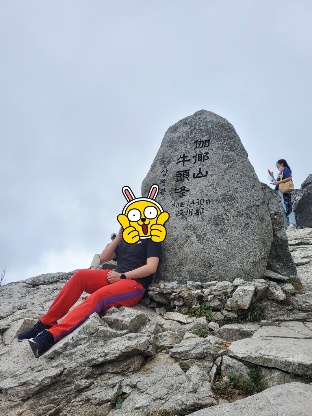 그렇게 거의 바닥난 체력으로 영차영차 가야산 정상인 상왕봉에 도착했다. 이 때가 1시 조금 넘었나 그랬던 것 같은데 우리빼고 나머지 팀들은 거의 다 정상에서 미리 준비해온 김밥 등으로 점심을 먹고 있었다. 우린 사갈까 고민하다 가져온 것은 결국 초코파이뿐.... 그냥 충분히 휴식을 취하고 내려갈 준비를 했다.