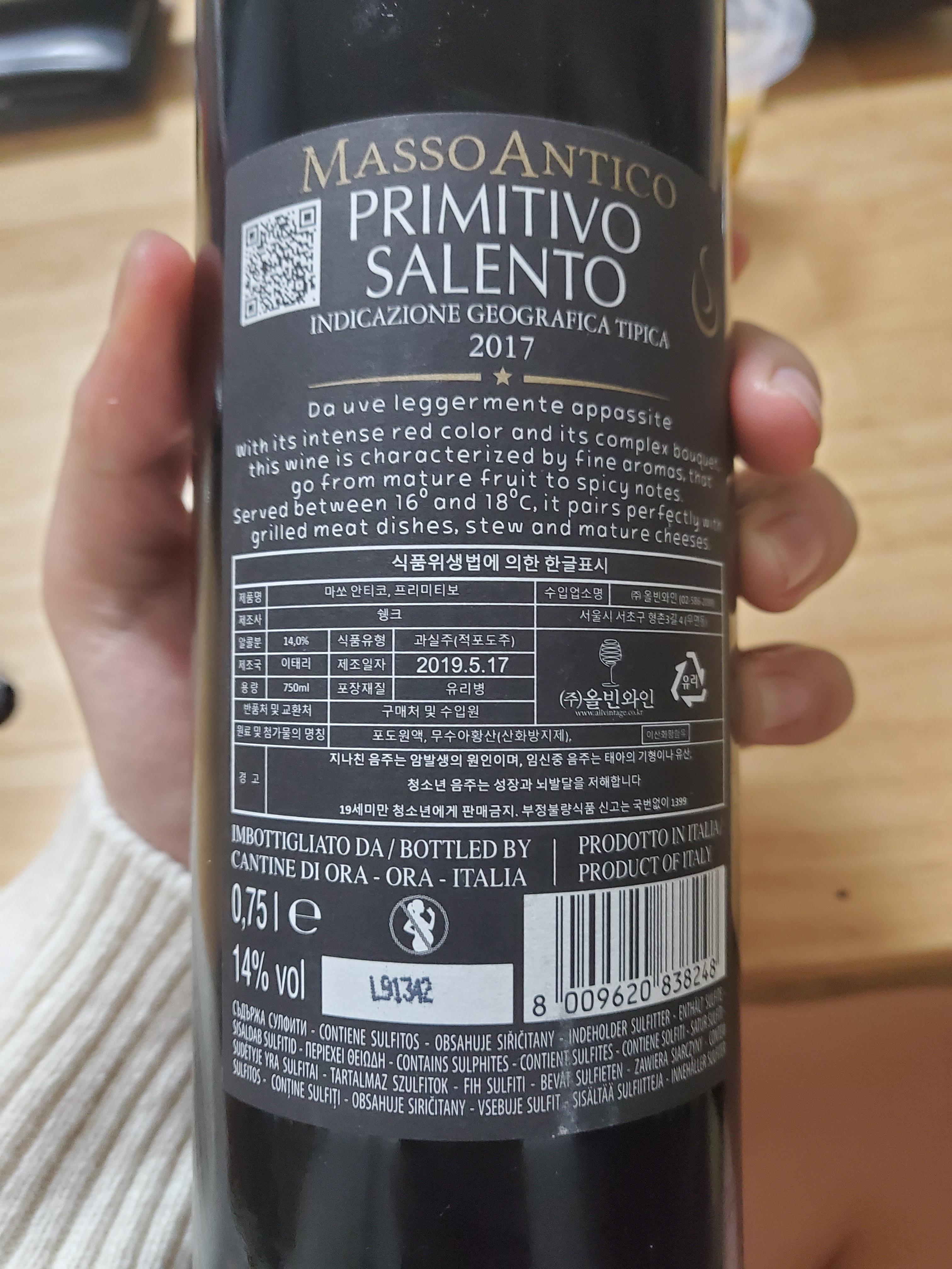 뒷면 정보를 보면, 제조일자 2019.5.17일로 설명에 써있듯이 충분한 숙성을 거친 와인이라는 것을 알 수 있다.