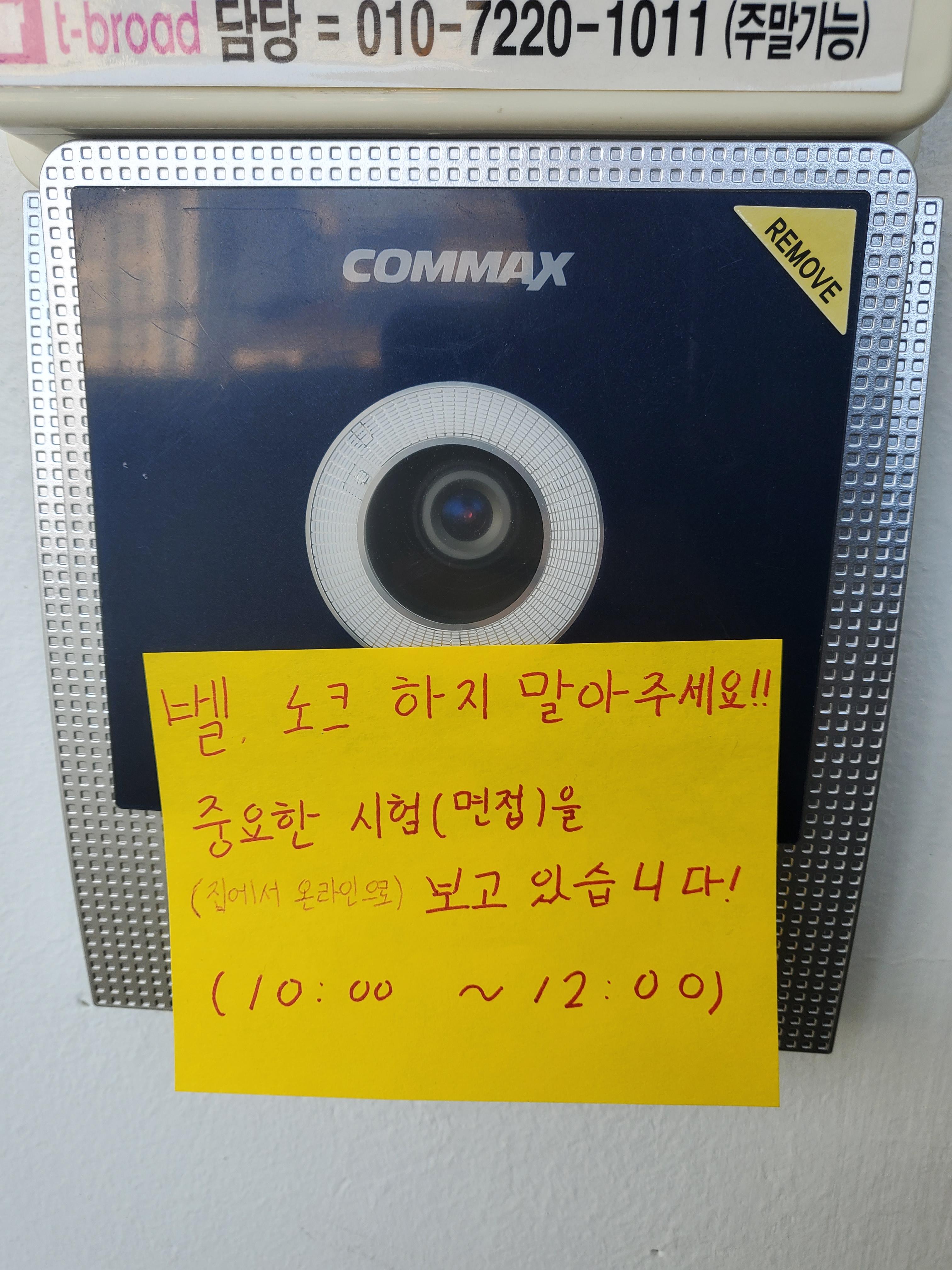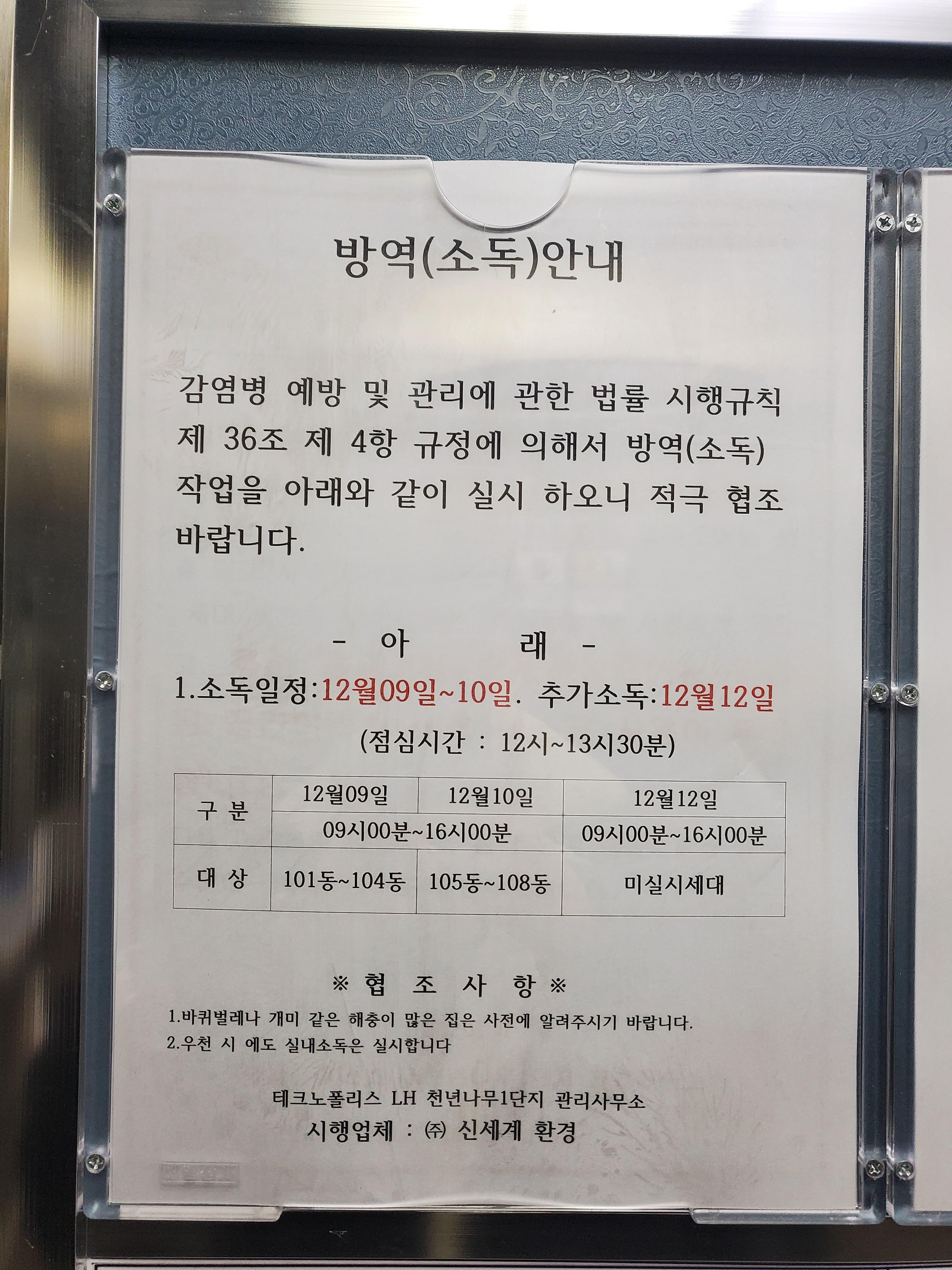 이제 모든 준비가 끝났다 싶었는데 아차차, 하필이면 이 시험시간에 아파트 소독이 온다고 공지가 붙어있었다. 평일에는 항상 9시 이전에 출근을 하고 있기 때문에 나는 당연히 추가소독일에 받을 수 밖에 없었다.