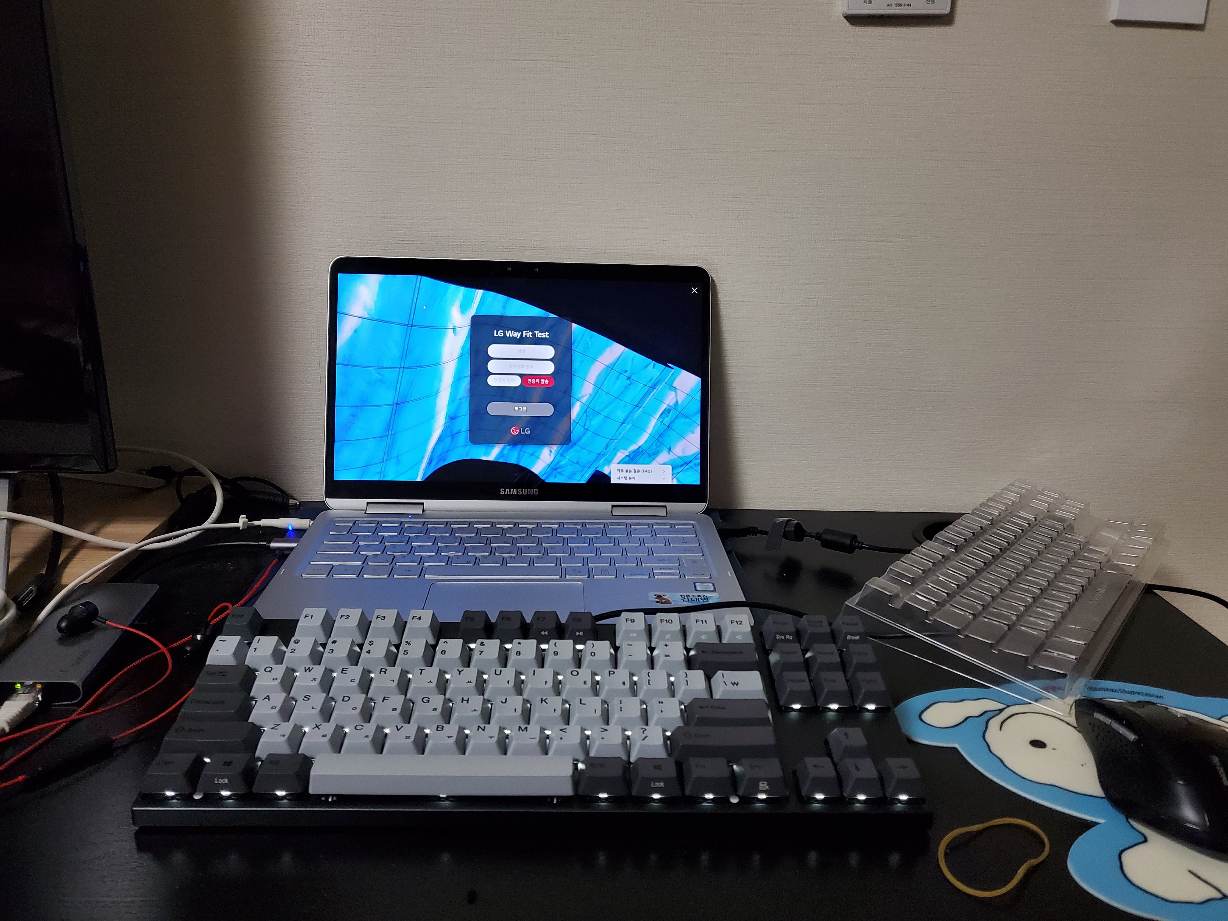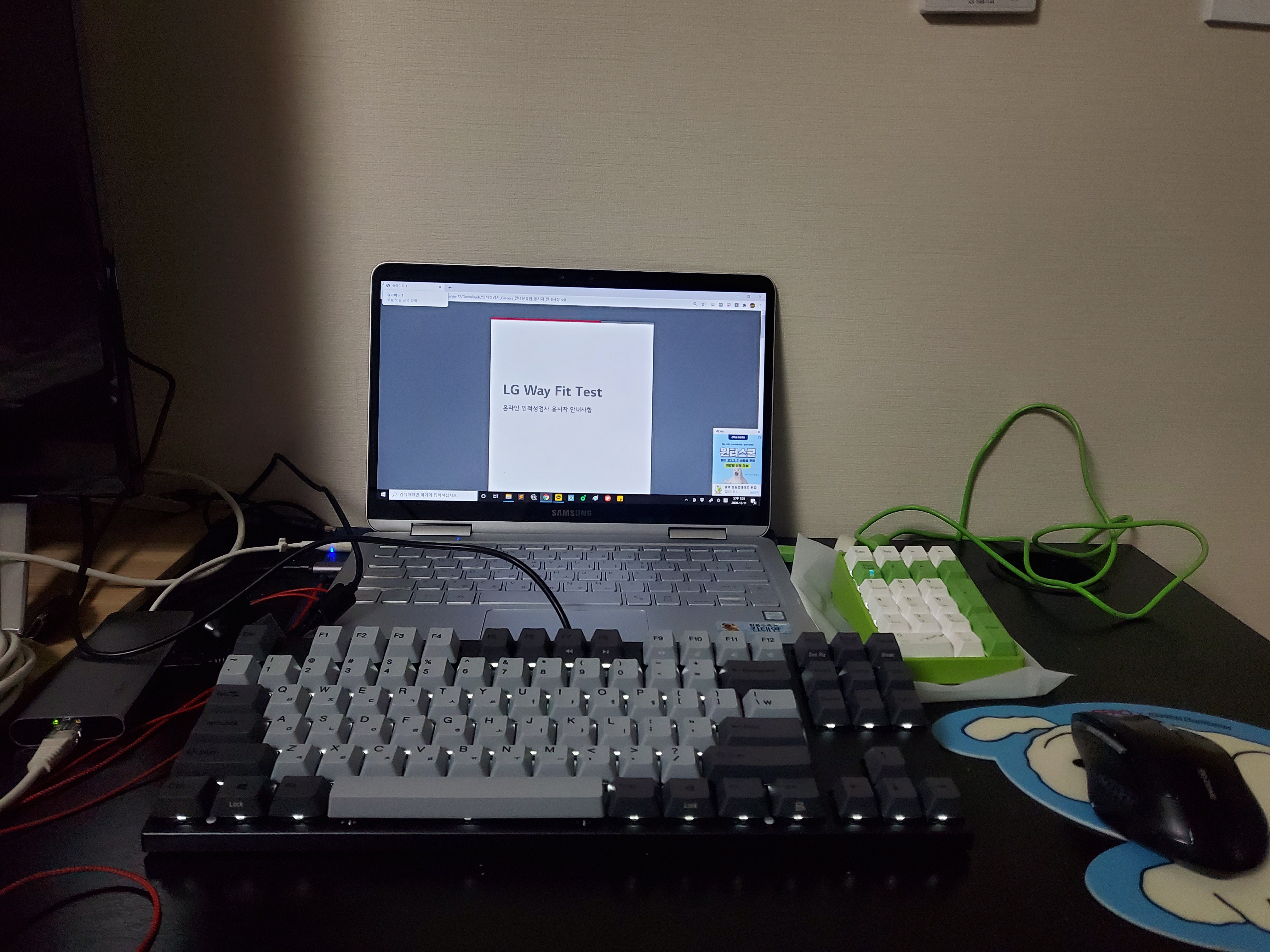 일단 응시환경 체크를 위해 사진처럼 세팅을 했다. 외부인이 접근할 수 있는 학교 연구실, 세미나실 등에서는 응시가 불가하다고 하여서 집에서 했고, 안정적인 네트워크 환경을 위해서 연구실에서 C to RAN 허브와 랜선을 챙겨와서 세팅을 했다. 사전 테스트를 하면서 한 가지 불편한 부분을 발견했다. 나는 텐키리스 키보드를 선호하는데, 시스템에서 계산기를 쓰기에는 텐키리스가 너무 불편했다. 그래서 연구실에서 사용하던 보조 키패드를 아래 사진처럼 최종 세팅해주었다.