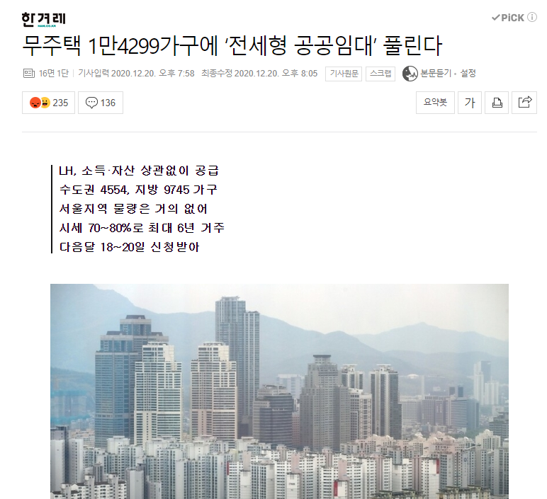 수요가 많으면 가장 기본적인 경제학 원리는 공급을 늘리는 것이라고 대학교 교양시간에 배웠다. 계속 규제를 하고 거의 전국의 광역시를 투기과열지구로 만들고, 공공주택 공실을 전세로 공급하는게 근본적인 공급을 늘리는 해결방안은 아닌 것 같다.