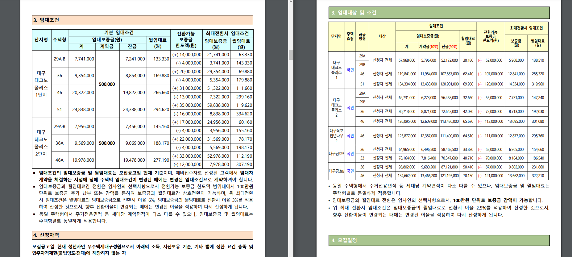 왼쪽 공고문은 올해 5월 12일부터 접수를 받은 국민임대 무순위 입주자 공고의 임대조건이고, 오른쪽 공고문은 이번에 올라온 전세형 임대주택의 임대조건이다.