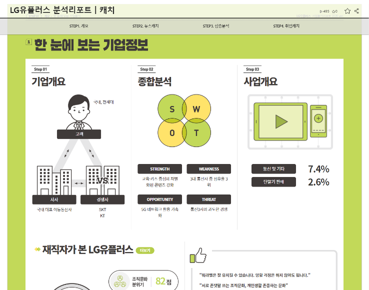 나 같은 경우는 캐치에서 제공하는 기업 분석 보고서와, LG 유플러스에서 자체 발표하는 지속가능경영보고서를 주로 많이 참고를 했다.