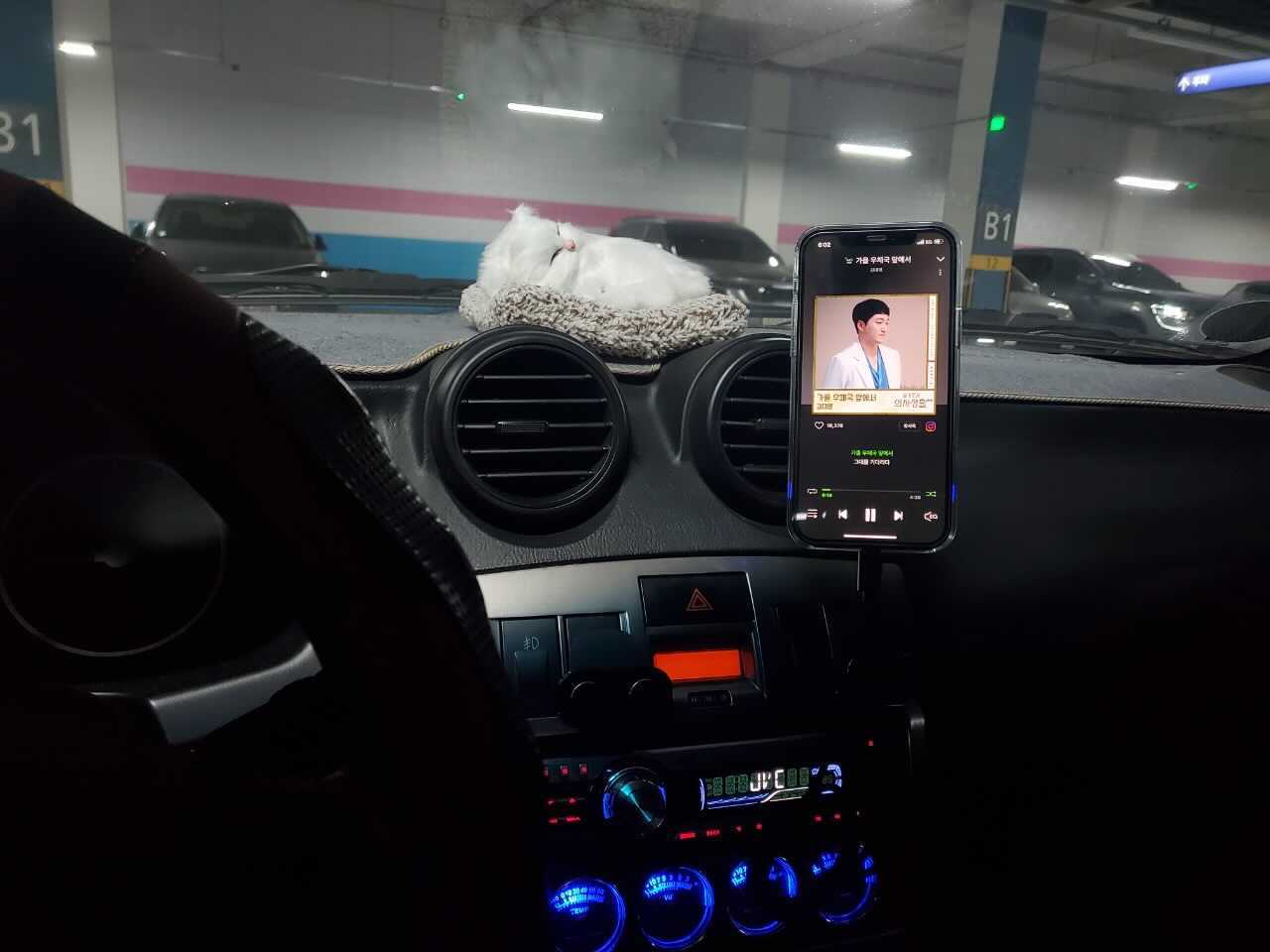 케이스를 끼고도 잘 붙어있다. 과속방지턱도 무리 없이 통과되고 사고가 날 정도의 급정거가 아니면 쉽게 떨어지지는 않을 것 같다. 차가 오래되서 블루투스 수신기가 없어서 어차피 AUX 선을 연결을 해야한다는 것은 아쉽지만, 그래도 다른 어느 거치대보다 깔끔하게 거치를 할 수 있고, 충전까지 된다. 얼핏 보면 휴대폰만 둥둥 떠있는 것 처럼 보이기도 한다.
